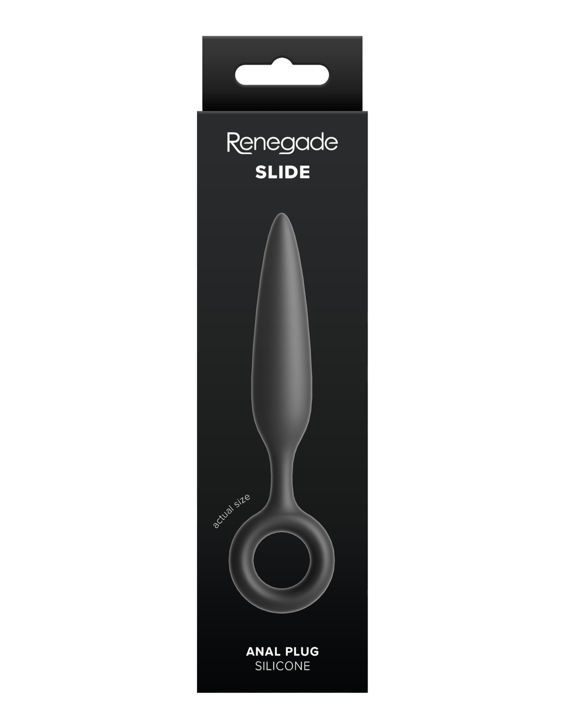 Renegade's Slide is a tapered and slim anal plug made of plush silicone with finger ring for comfort and control. Perfect for beginners. Compatible with all lubricants.