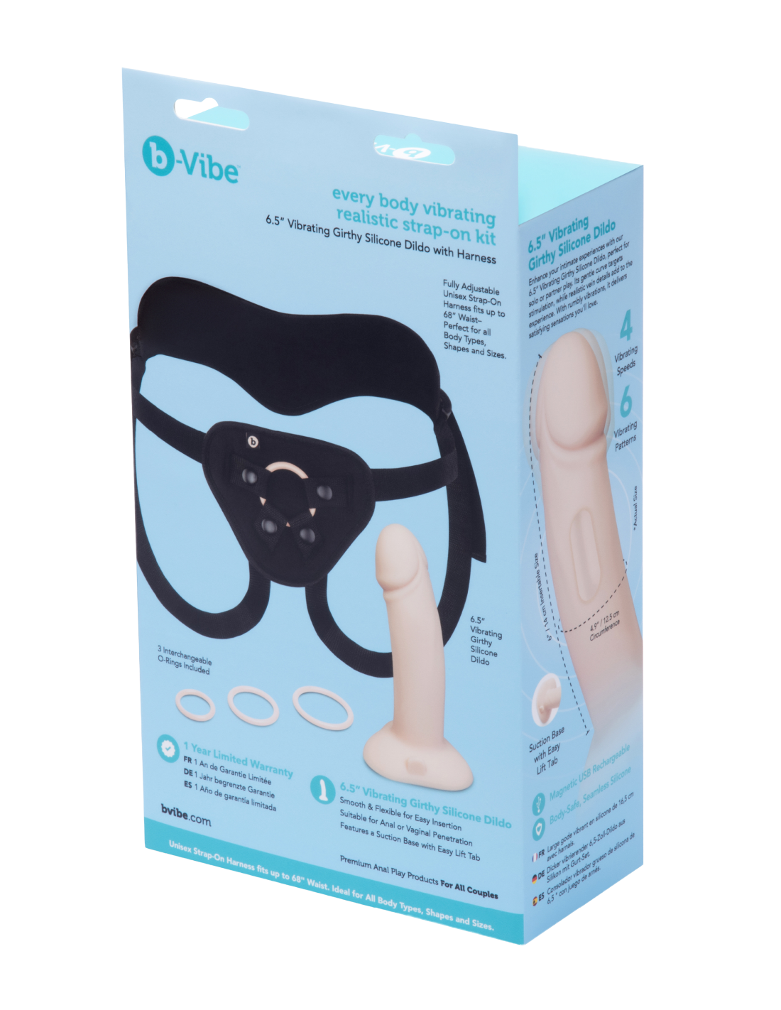 - Inclusive Fit: Includes three interchangeable silicone o-rings, accommodatinga 6.5” Vibrating Girthy Silicone Dildo. The harness fits comfortably up toa 68” waist, making it perfect for most body types, shapes and sizes.