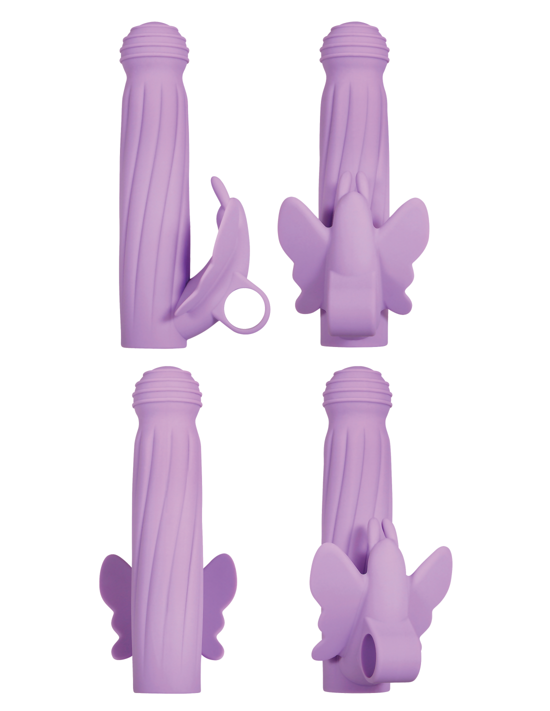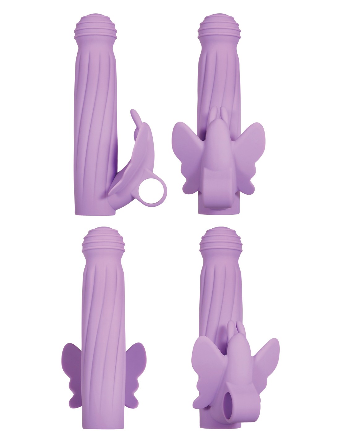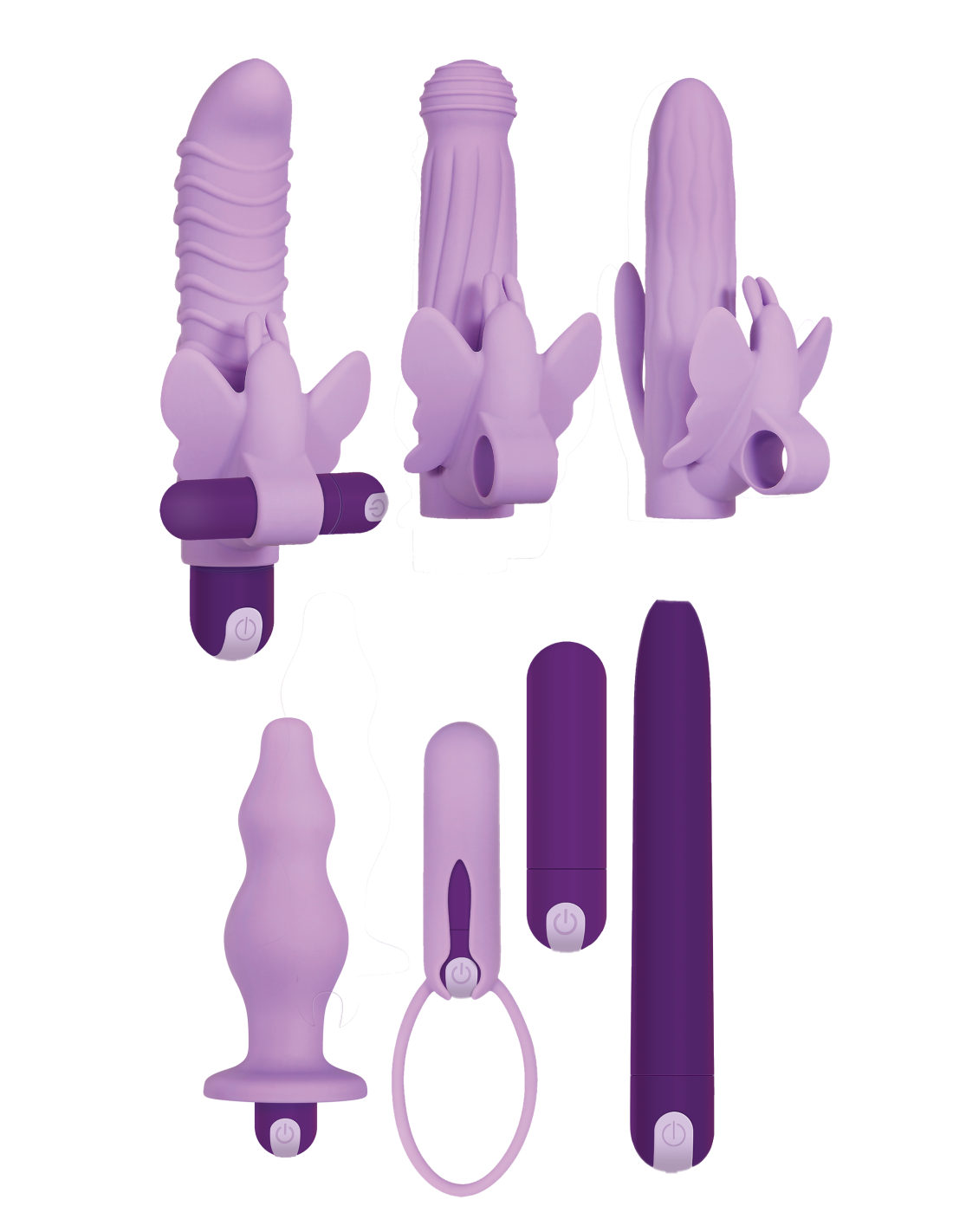 Regálate una nueva experiencia de placer cada vez que abras tu Kit Mariposa de 7 piezas. Elija costillas cosquillas con una punta de punto G, texturas verticales suaves con una cabeza bulbosa y regordeta, una manga acolchada con una puerta trasera sorpresa o un tapón anal suave y cremoso: cada una de estas formas sexys se deslizan sobre su 7 velocidades de 10. -inch plus vibe para crear un juguete único y poderoso en todo momento. No olvides deslizar la bala de 10 velocidades en la pieza del clítoris en forma de mariposa para obtener el pièce de résistance: ¡un impulso extra de felicidad que te llevará a la cima! La bala también viene con su propia funda con bucle y todo el kit es completamente sumergible en agua, para que puedas explorar en el baño o la ducha. Limpie con un limpiador de juguetes y enjuague con agua tibia.