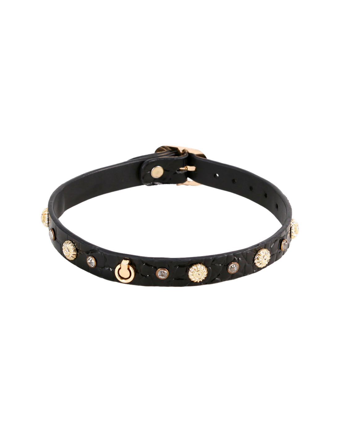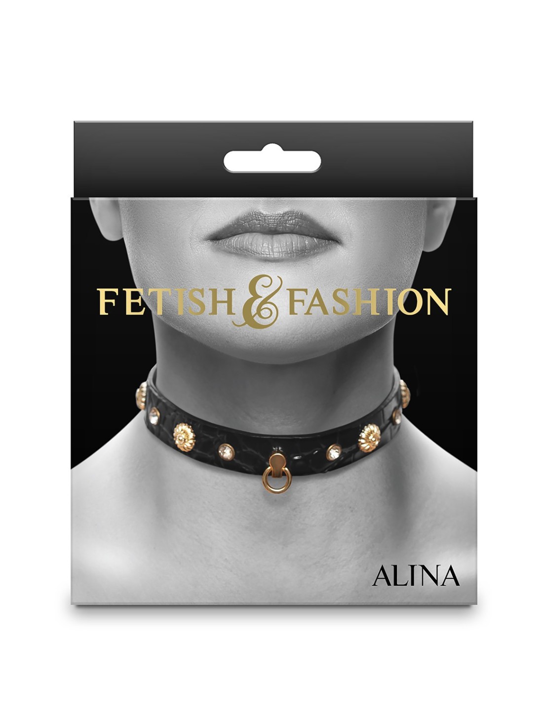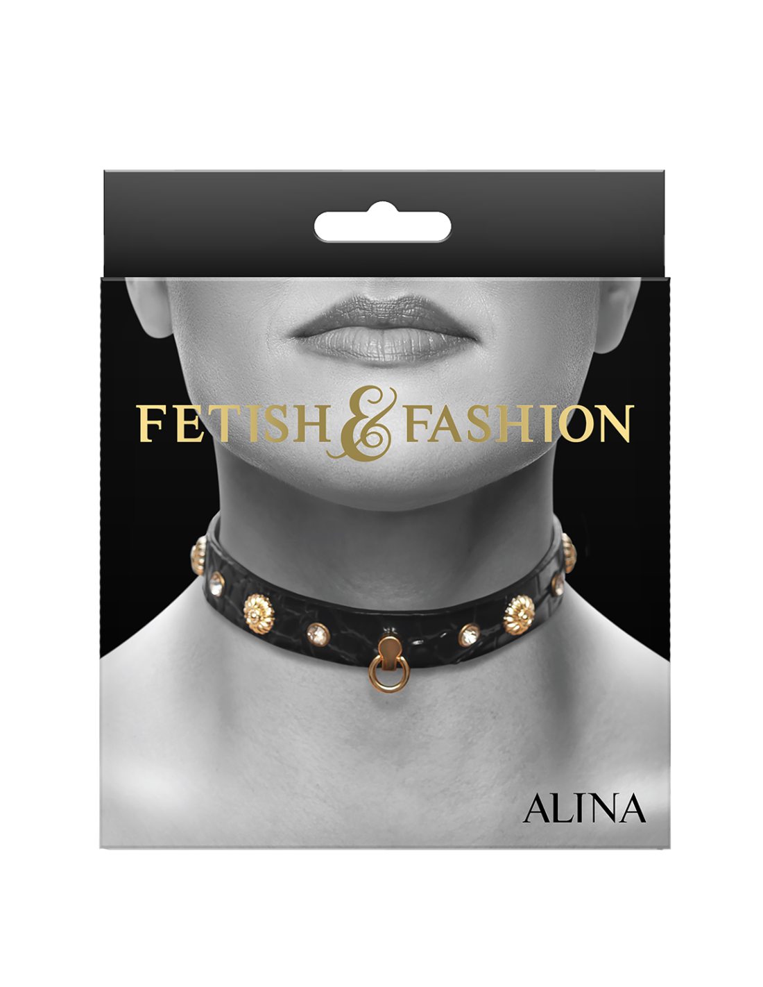 Fetish & Fashion’s Alina Collar is perfect for a submissive lover. Designed for neck sizes from 11.5 to 17.5 inches and garnished with crystal gems and golden sun charms, Alina features an adjustable buckle closure and O-ring for a tether or leash. Crafted from man-made materials (PU) and nickel-free hardware. Leash sold separately.