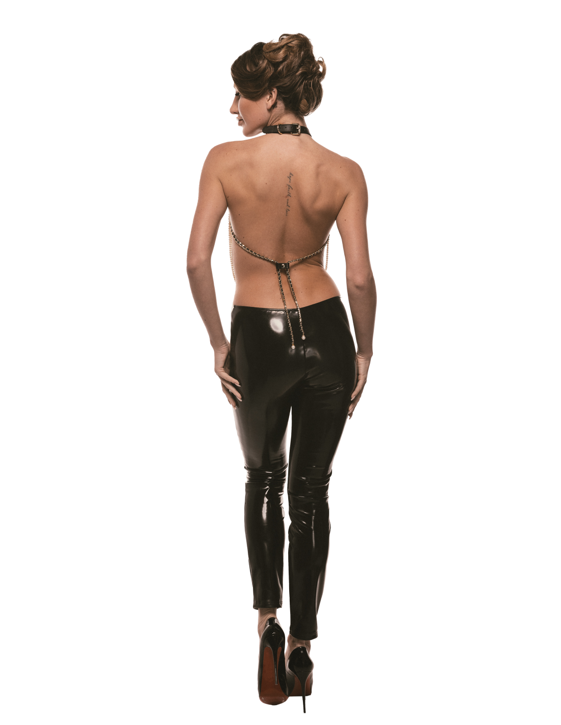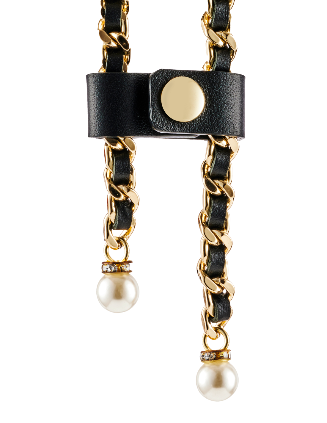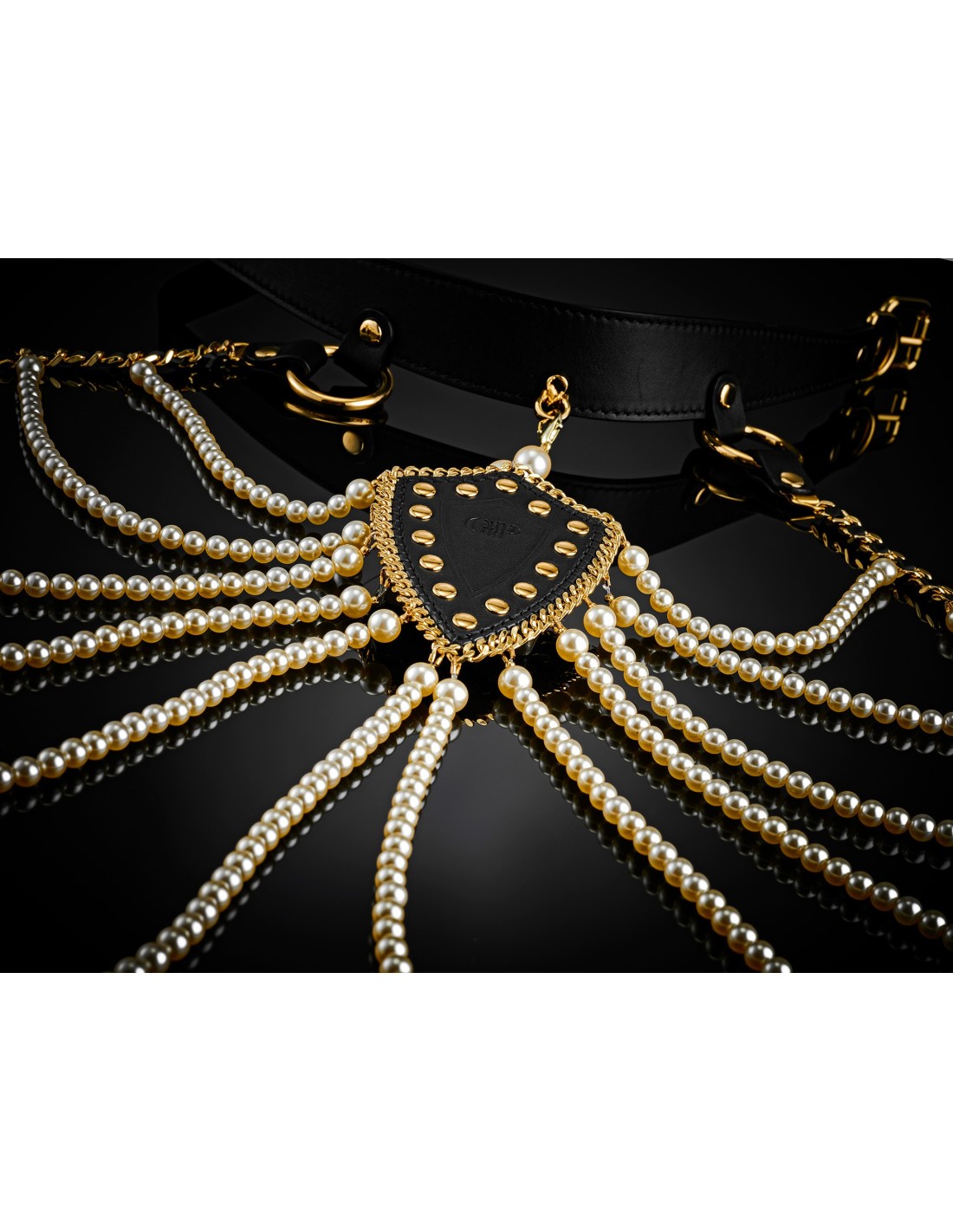 Crafted for comfort as well as allure, the collar fits gently around the neck and is fully adjustable for a secure yet comfortable fit. The pearl chains are lightweight and fluid, designed to move gracefully with the body, enhancing visual appeal during intimate play or layered with outerwear for bold styling. Gold-toned hardware completes the high-end finish, offering a refined, upscale presentation.