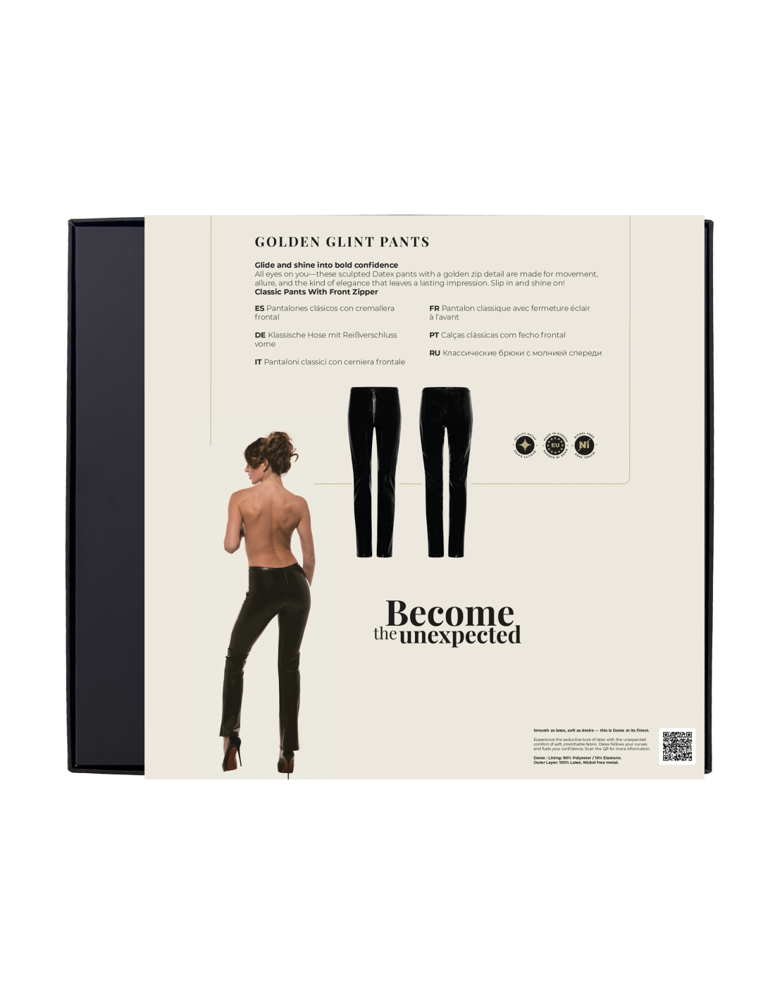 The Golden Glint Pants combine bold confidence with high-gloss sophistication. Crafted from premium Datex, these classic-cut pants contour the body with sleek precision, offering a silhouette that moves with intention and allure.