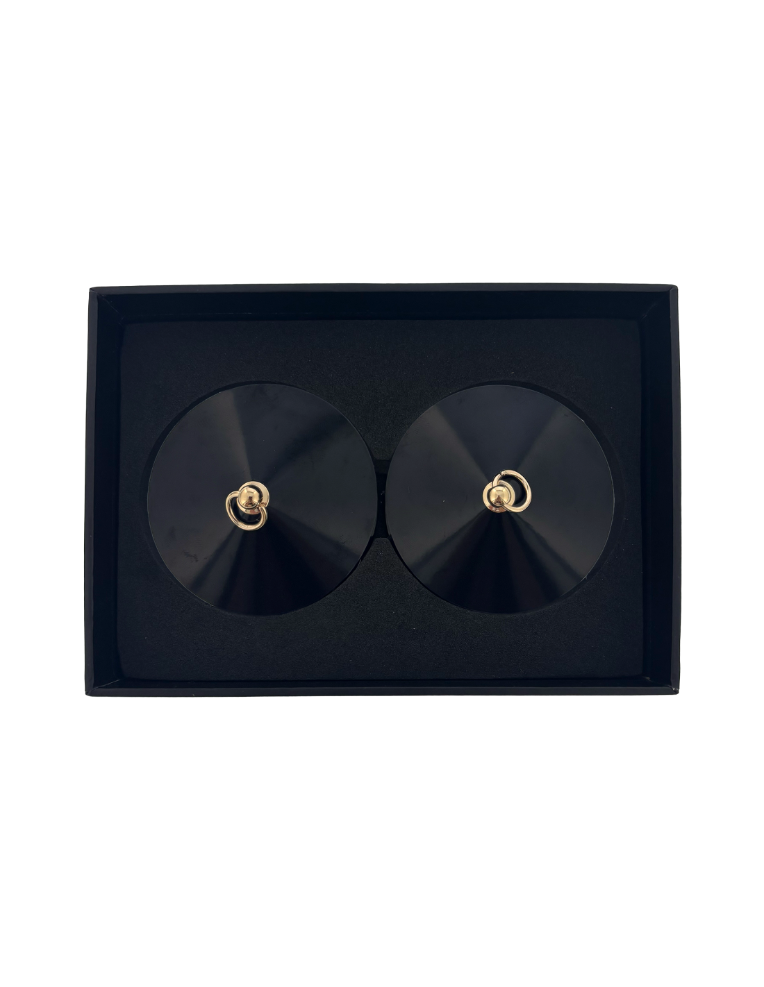 Gilded temptation with a noir edge. The black Linking Loop Covers fuse bold elegance with playful intent. Sculpted from polished black-toned metal and finished with a gold-coloured central ring, these reusable nipple covers make a commanding statement in contrast and control. Their smooth silhouette reflects light, while the ring offers a provocative focal point — inviting creative styling or tactile exploration.