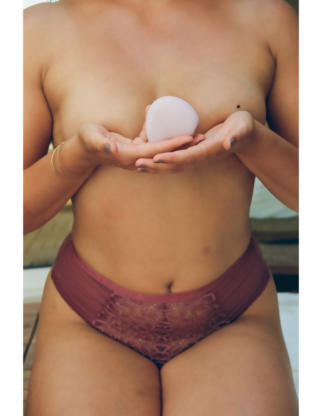 • STEP 2 - Place MEA so that the opening surrounds your external clitoris. Guide the toy with your thumb, index, and middle fingers.