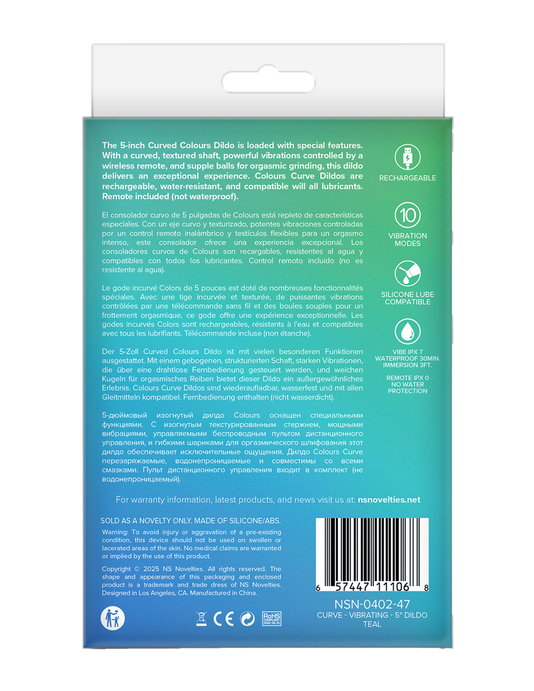 The 5-inch Curved Colours Dildo is loaded with special features. With a curved, textured shaft, powerful vibrations controlled by a wireless remote, and supple balls for orgasmic grinding, this dildo delivers an exceptional experience. Colours Curve Dildos are rechargeable, water-resistant, and compatible will all lubricants. Remote included (not waterproof).
