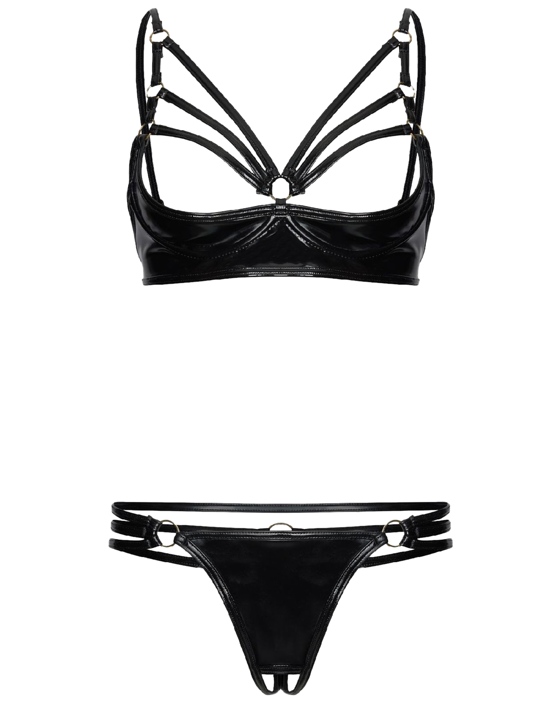 The strappy half-cup bra artfully frames the bust, offering visual intrigue and a supportive yet revealing fit. Paired with a matching open-crotch string, this set is crafted to contour the body, enhancing natural curves while leaving a lasting impression.