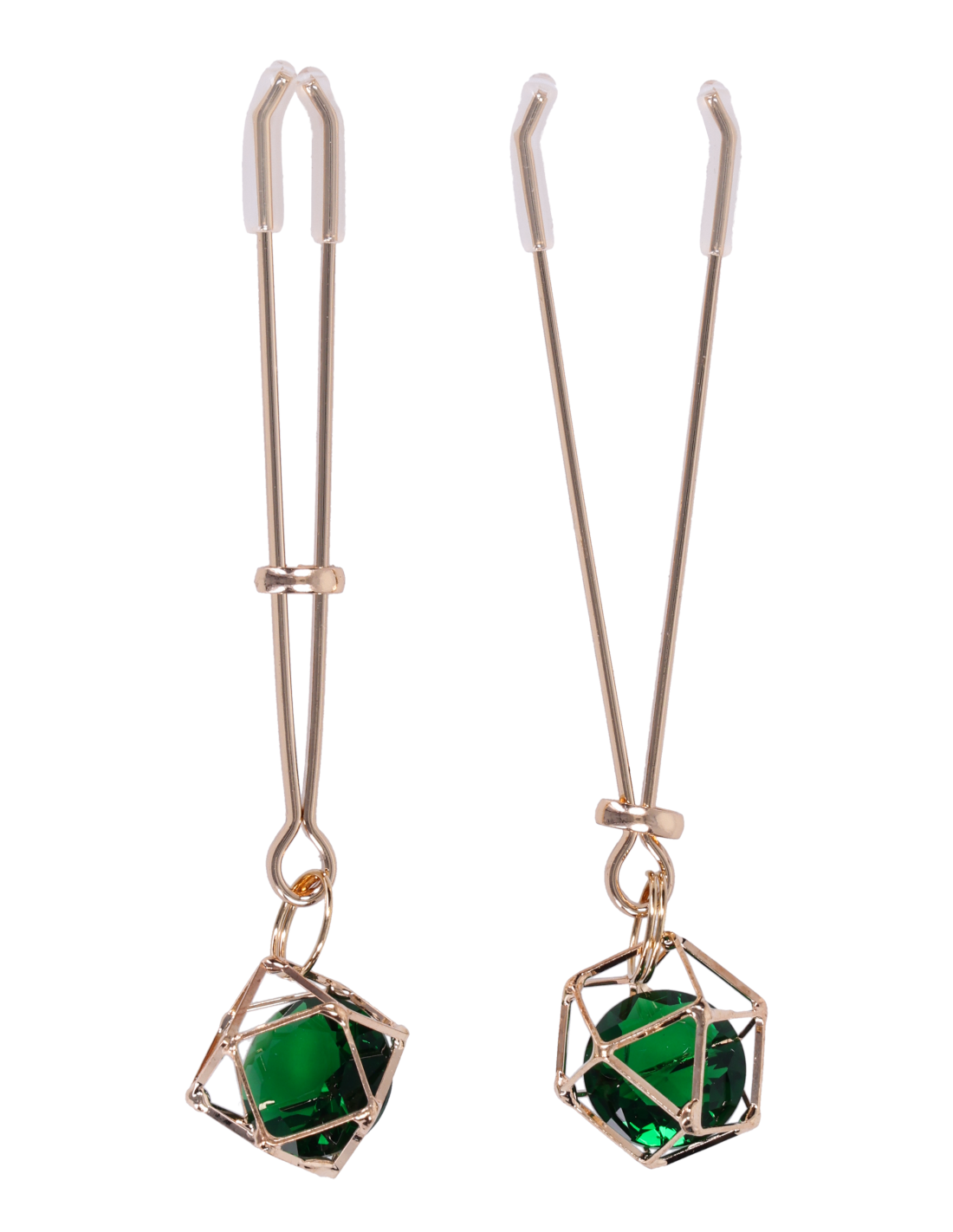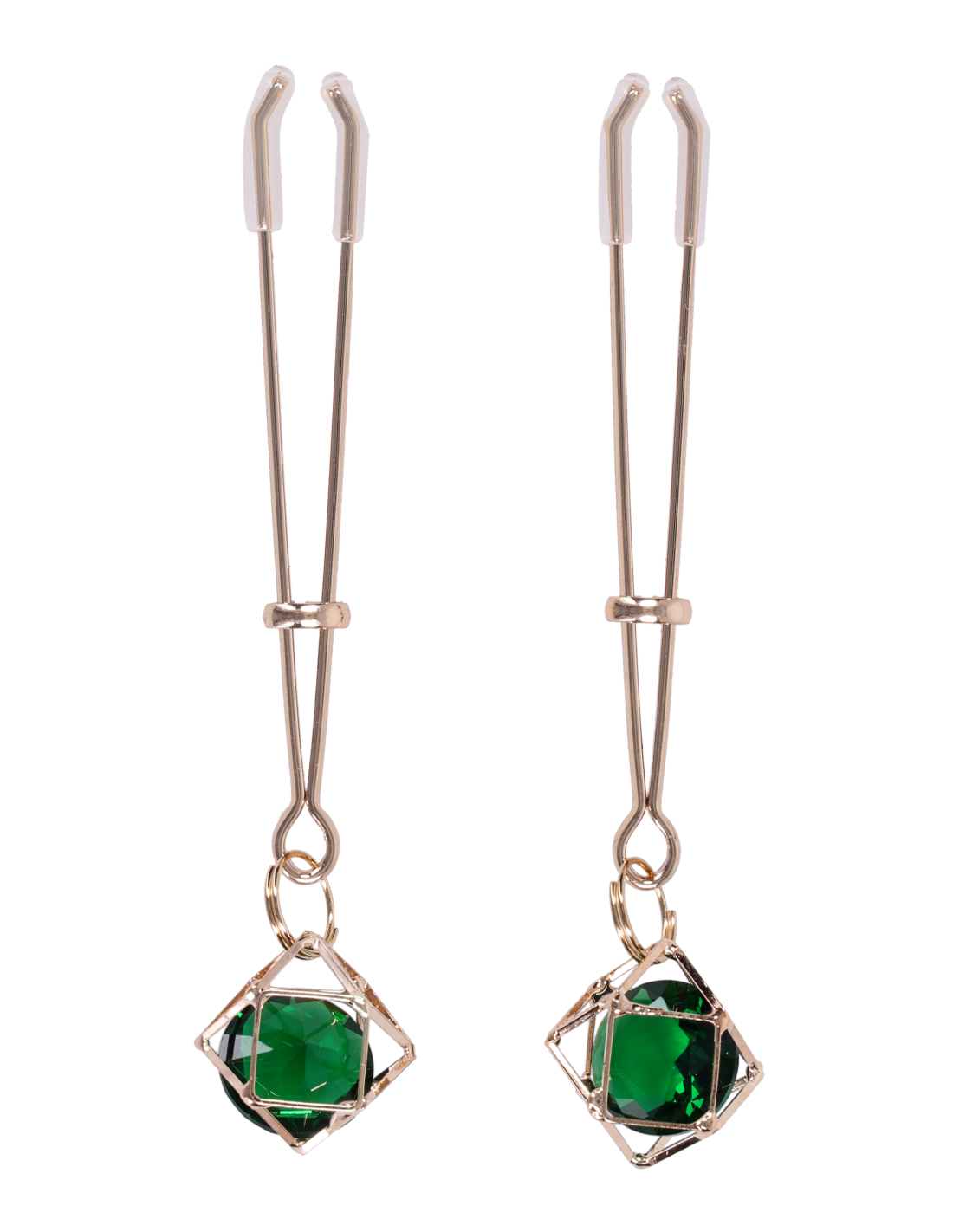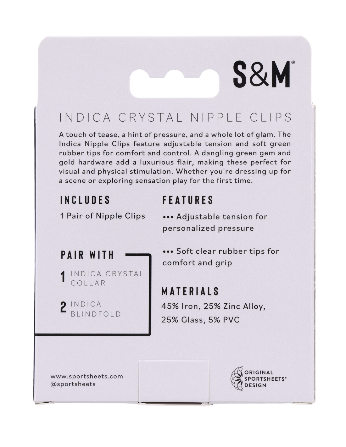 A touch of tease, a hint of pressure, and a whole lot of glam. The Indica Nipple Clips feature adjustable tension and soft rubber tips for comfort and control. A dangling green gem and gold hardware add a luxurious flair, making these perfect for visual and physical stimulation. Whether you're dressing up for a scene or exploring sensation play for the first time, these clips deliver pleasure with style.