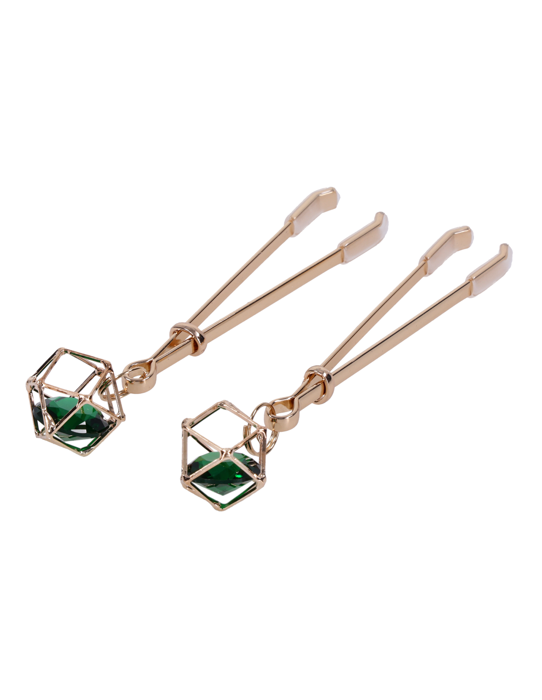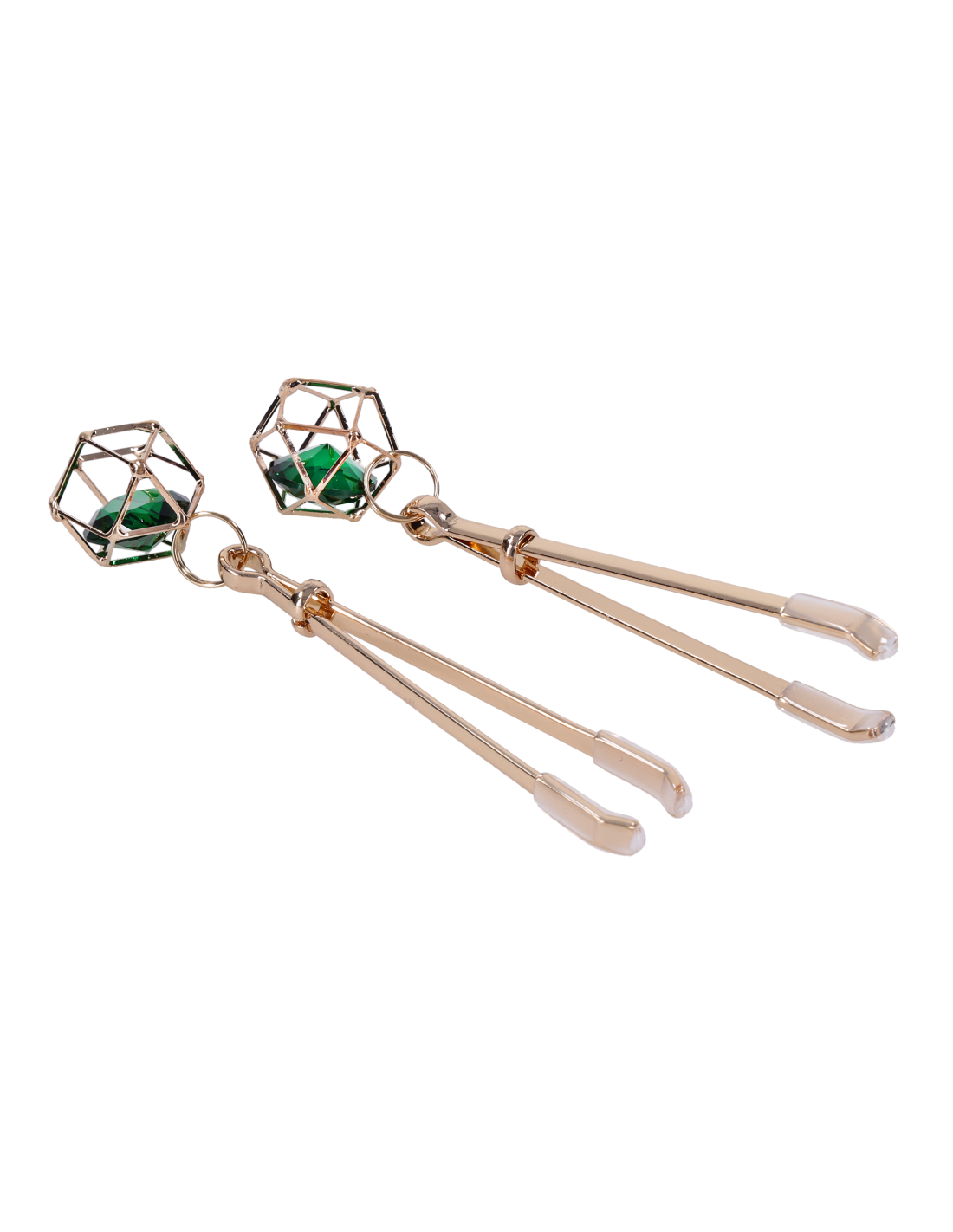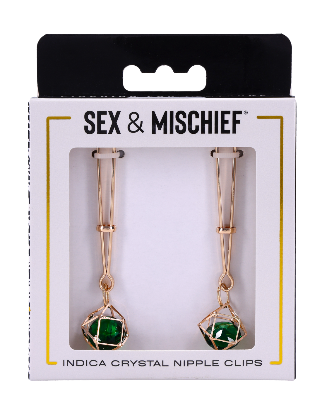 A touch of tease, a hint of pressure, and a whole lot of glam. The Indica Nipple Clips feature adjustable tension and soft rubber tips for comfort and control. A dangling green gem and gold hardware add a luxurious flair, making these perfect for visual and physical stimulation. Whether you're dressing up for a scene or exploring sensation play for the first time, these clips deliver pleasure with style.