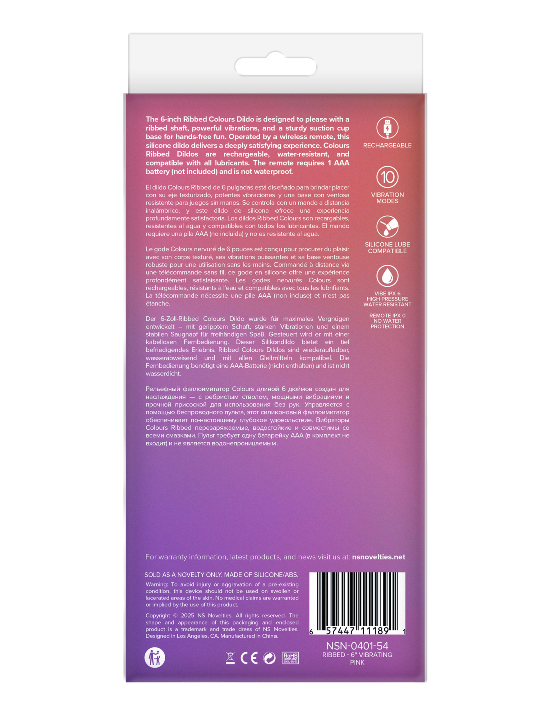 The 6-inch Ribbed Colours Dildo is designed to please with a ribbed shaft, powerful vibrations, and a sturdy suction cup base for hands-free fun. Operated by a wireless remote, this silicone dildo delivers a deeply satisfying experience. Colours Ribbed Dildos are rechargeable, water-resistant, and compatible with all lubricants. The remote requires 1 AAA battery (not included) and is not waterproof.
