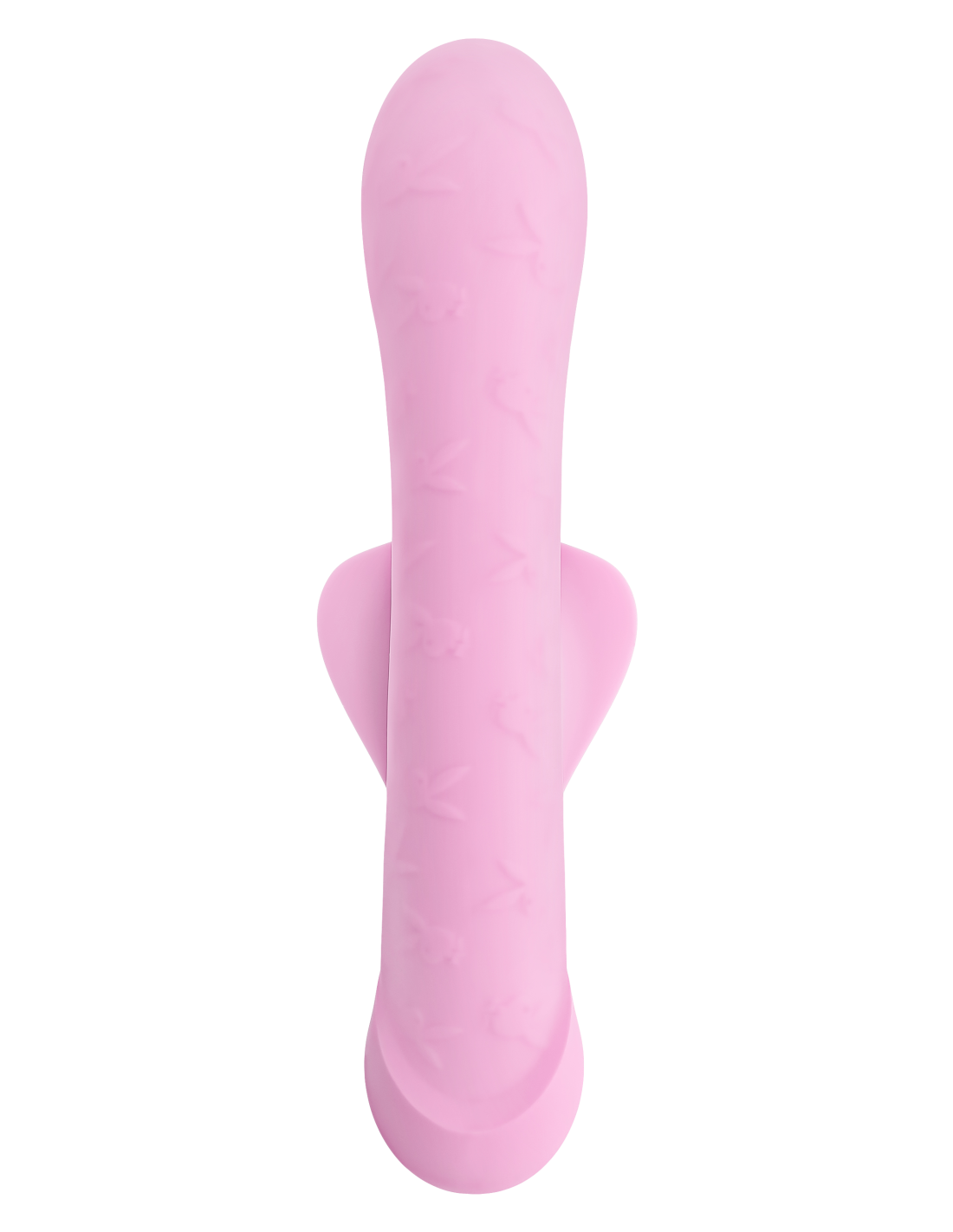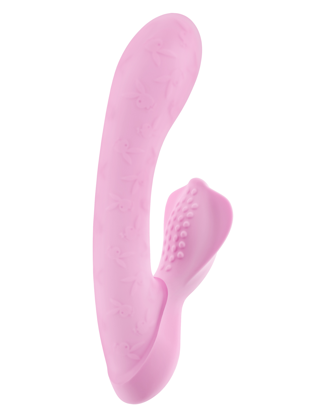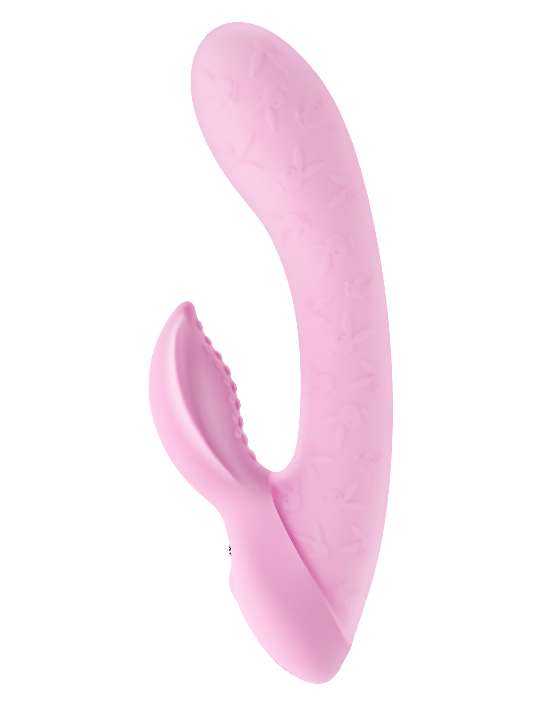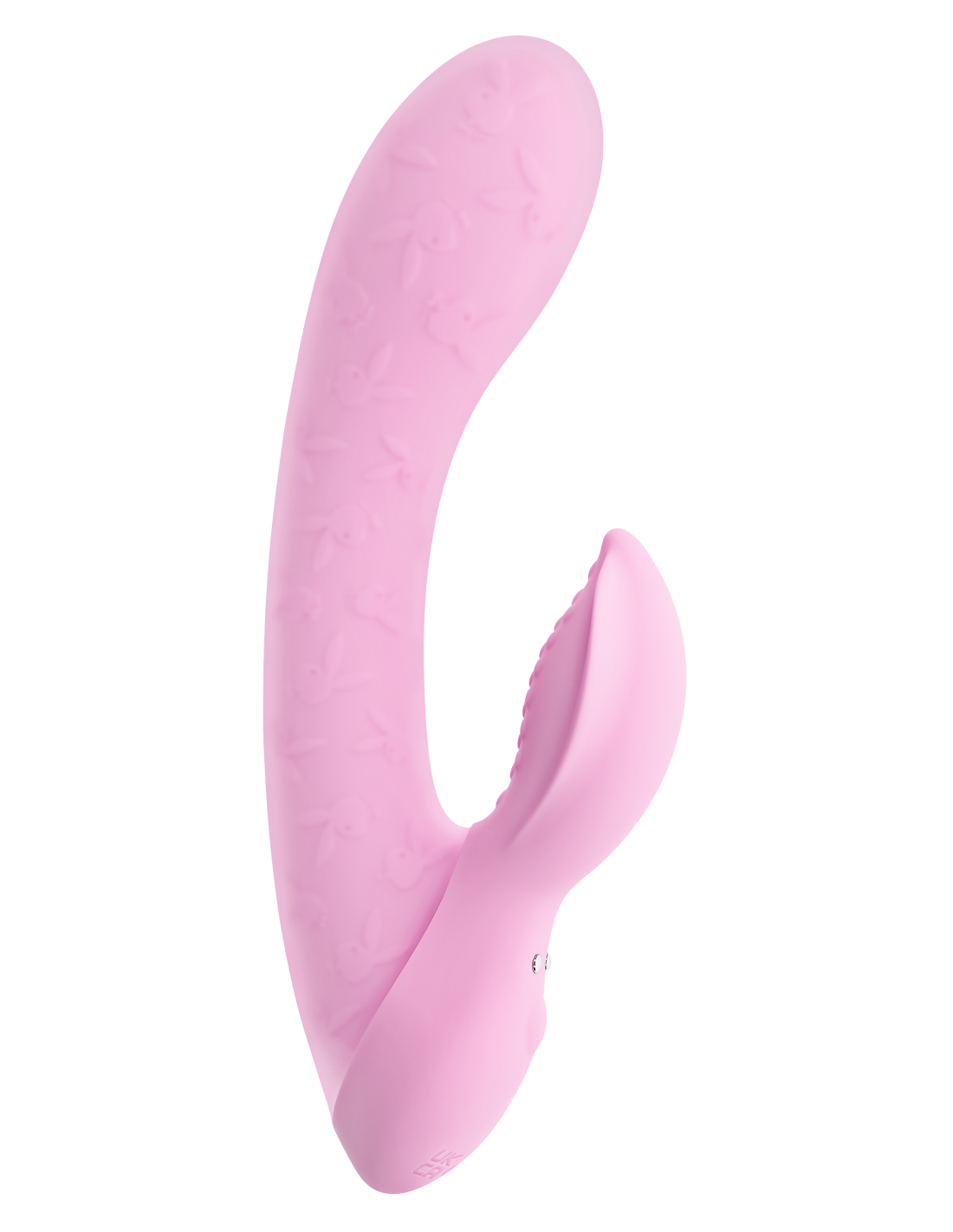 Rabbit Party tonight! Follow the bunny trail to this powerful dual Vibrator that’s got some hopping good features. The flexible, gently curved shaft is covered in Playboy rabbit heads that tickle as you play, not to mention the dual-layered silicone material which has a truly life-like feel you have to experience to believe. But that’s not all - this bunny has more tricks up its sleeve! In a twist on the usual rabbit ears, the stimulator shaft is shaped like a petal to surround the clitoris and drive vibrations deep into that primary erogenous zone for a whole new level of satisfaction. With a chunky handle and easy 1-button control for both motors simultaneously, you’ve hit the bunny jackpot!