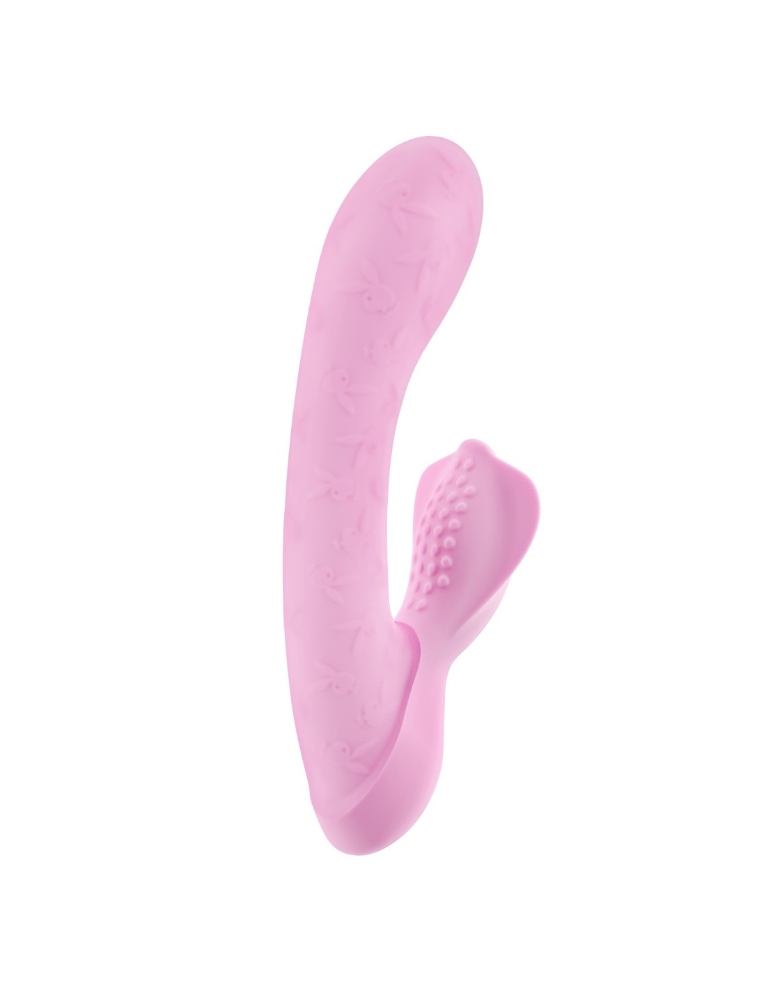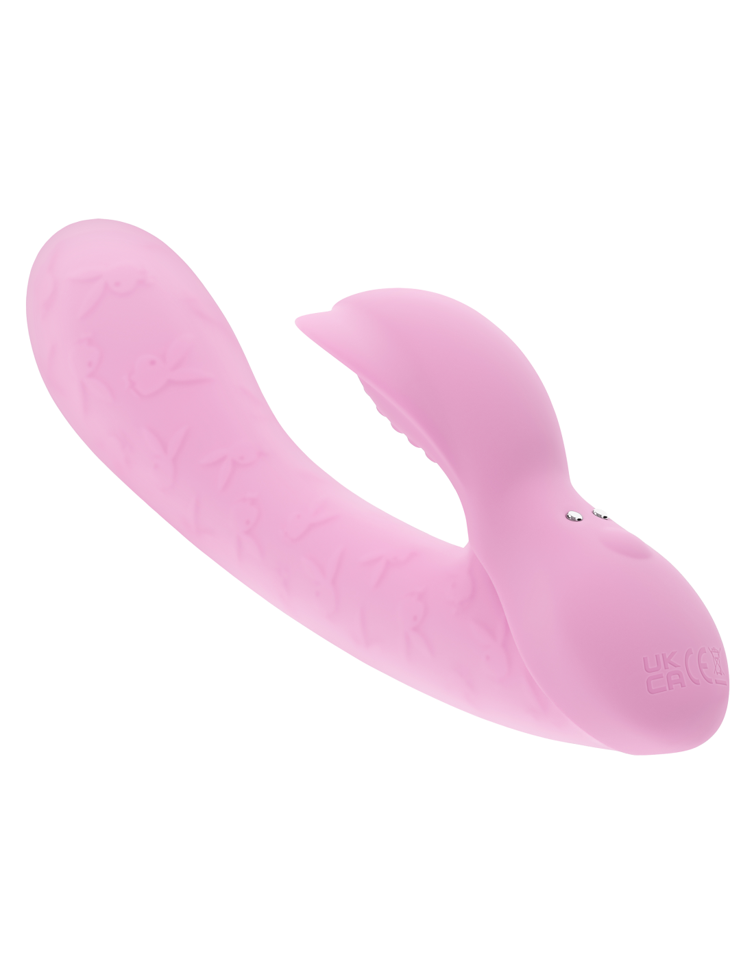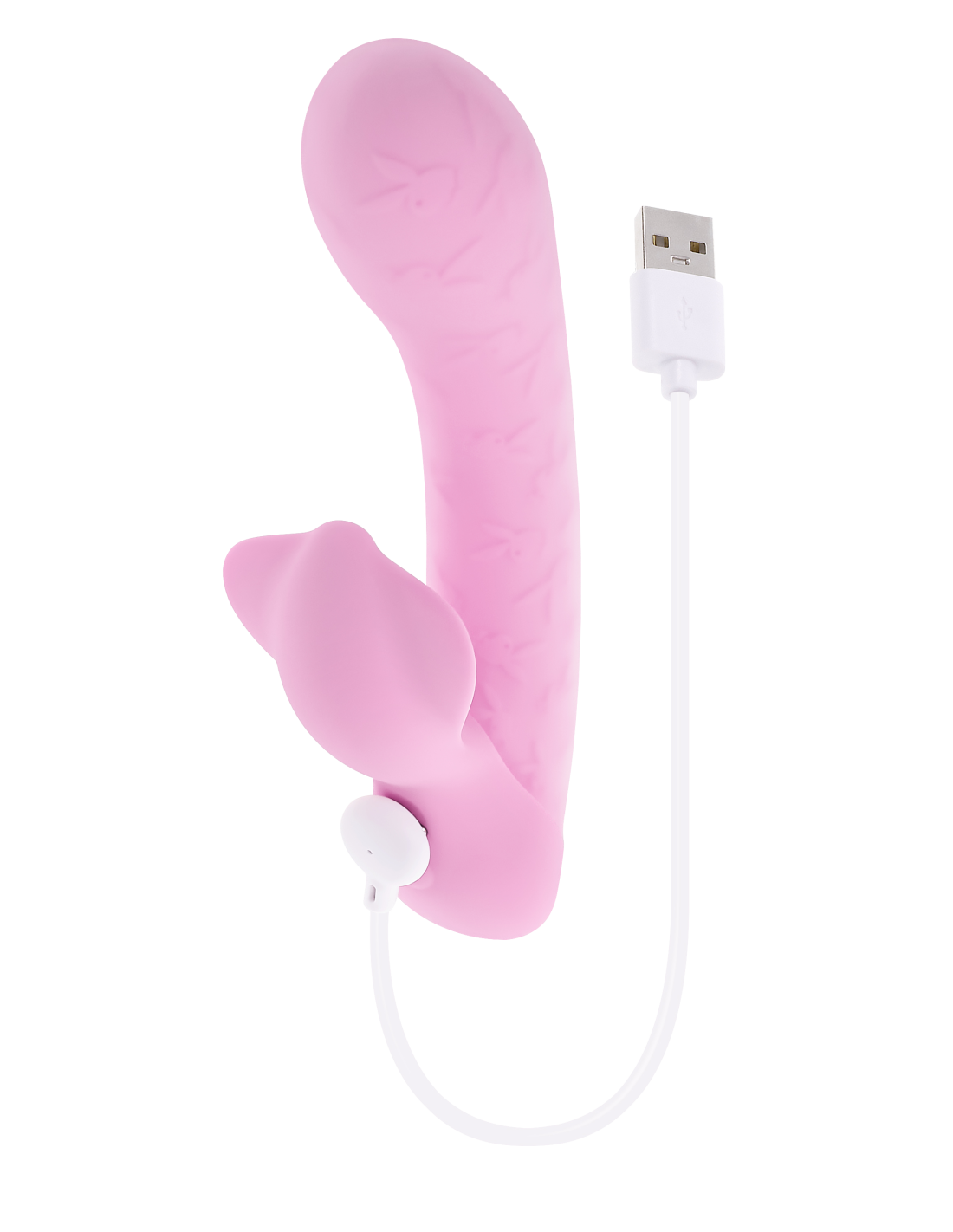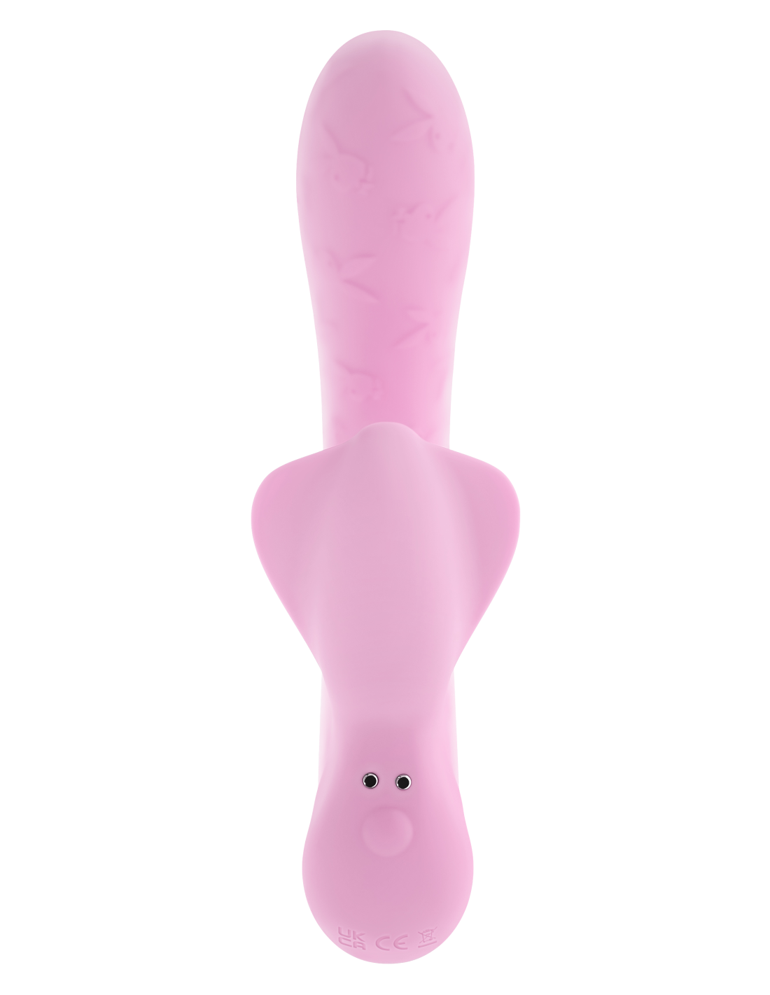 Rabbit Party tonight! Follow the bunny trail to this powerful dual Vibrator that’s got some hopping good features. The flexible, gently curved shaft is covered in Playboy rabbit heads that tickle as you play, not to mention the dual-layered silicone material which has a truly life-like feel you have to experience to believe. But that’s not all - this bunny has more tricks up its sleeve! In a twist on the usual rabbit ears, the stimulator shaft is shaped like a petal to surround the clitoris and drive vibrations deep into that primary erogenous zone for a whole new level of satisfaction. With a chunky handle and easy 1-button control for both motors simultaneously, you’ve hit the bunny jackpot!