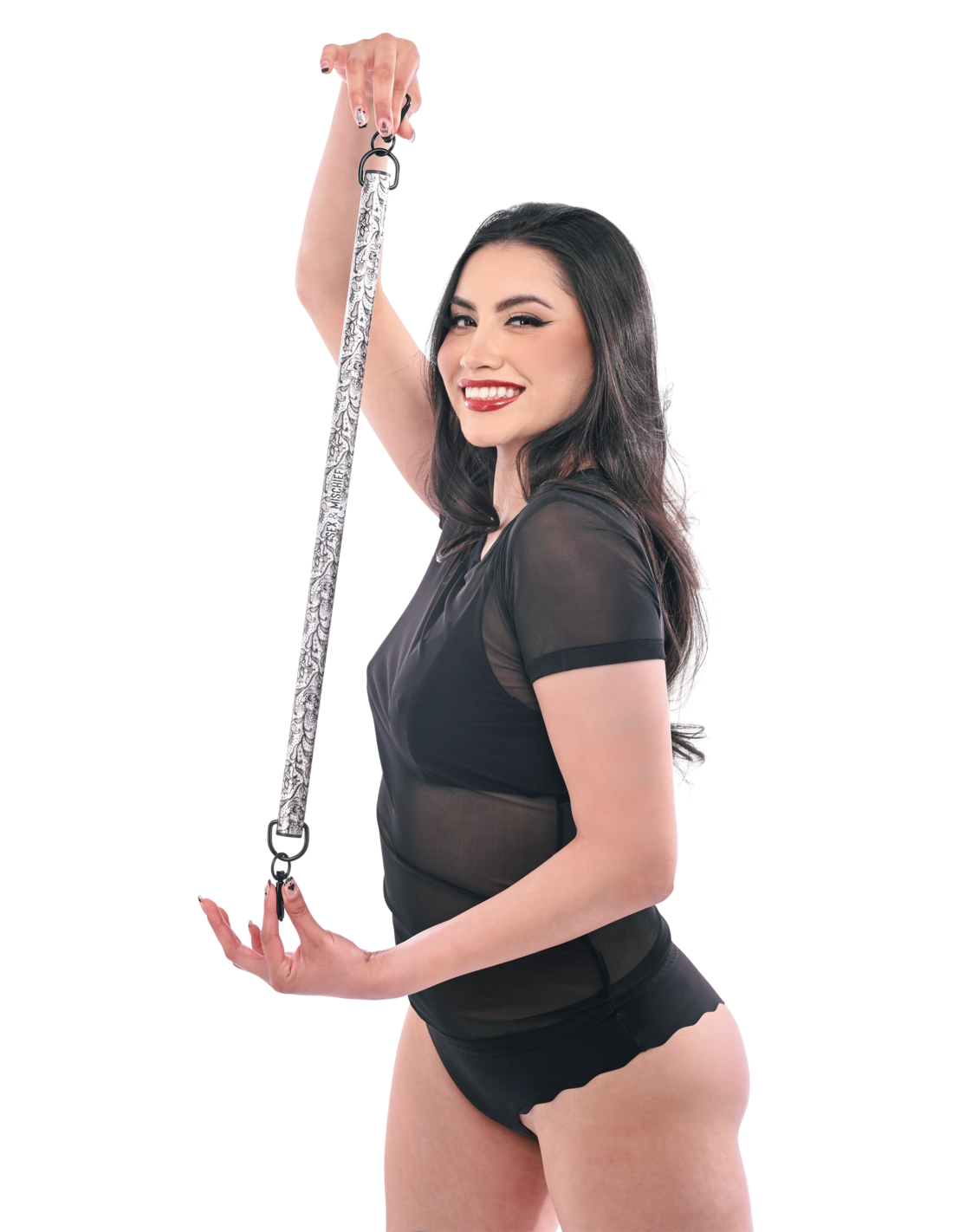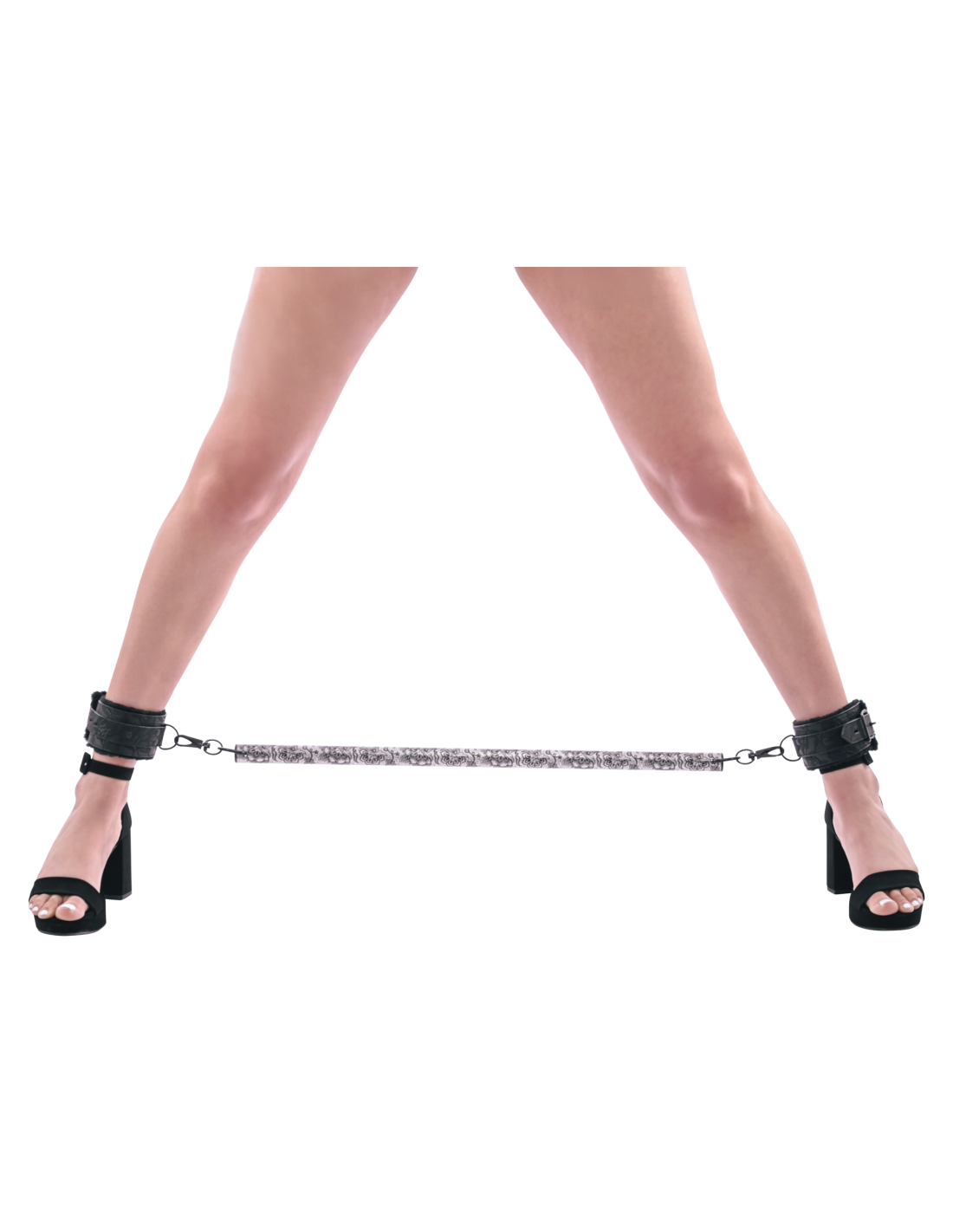 Indulge in the perfect blend of sophistication and seduction with this sultry metal spreader bar, adorned with an elegant black lace-etched design. The intricate detailing adds a sexy, refined edge, transforming restraint into an art form. Designed for both style and function, this spreader bar features sleek black clasps on each end, ensuring a quick and secure connection for effortless play. Whether you're exploring new levels of control or enhancing your intimate moments, this sensual yet sophisticated piece is crafted to captivate, tempt, and tease.