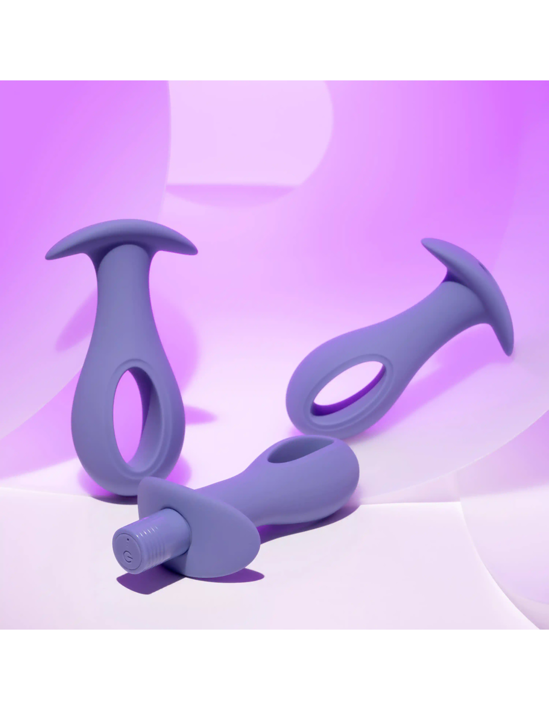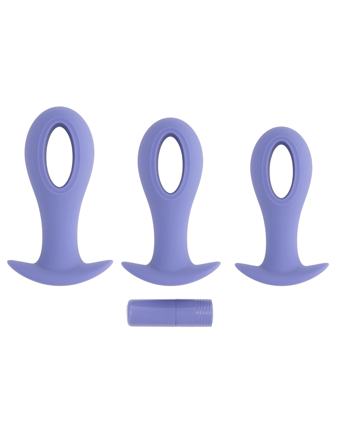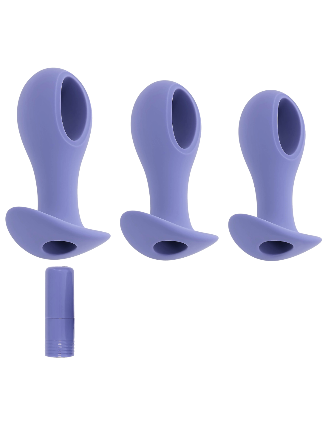 These oval-shaped hollow-center silicone plugs are flexible at the head and stem for easy entry with their unique ‘hole punch’ design. Powered by a robust vibrating bullet that tucks into each base seamlessly, choose from 3 sizes, each anchored by a wide safety base.