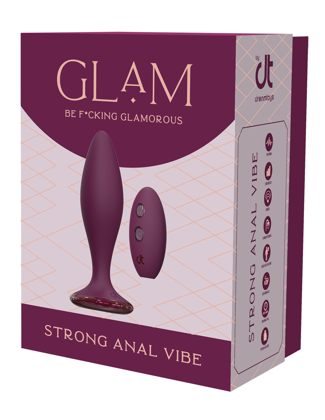 Anal vibrator with wireless remote control. this Glam anal vibe has strong vibrations in 3 speeds and 7 rhythms. It's shower friendly, made of bodysafe materials and rechargeable with the included magnetic USB cable.