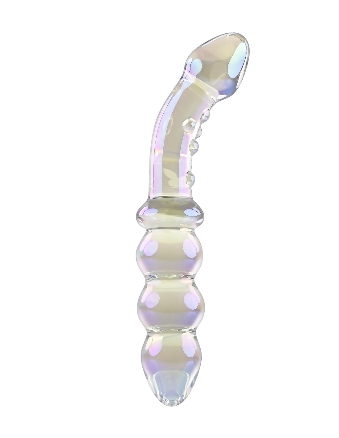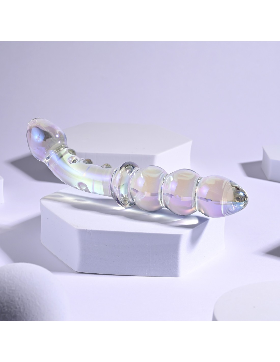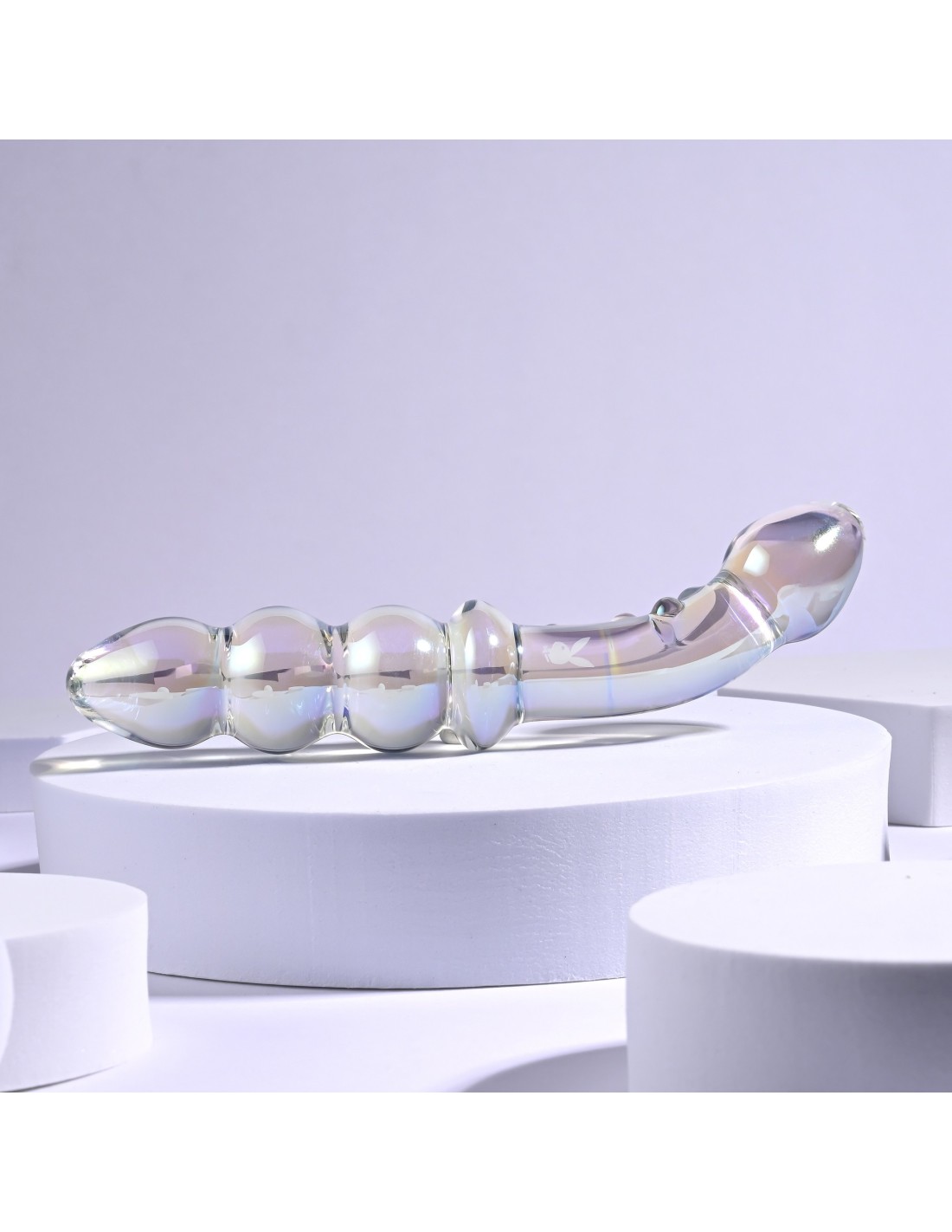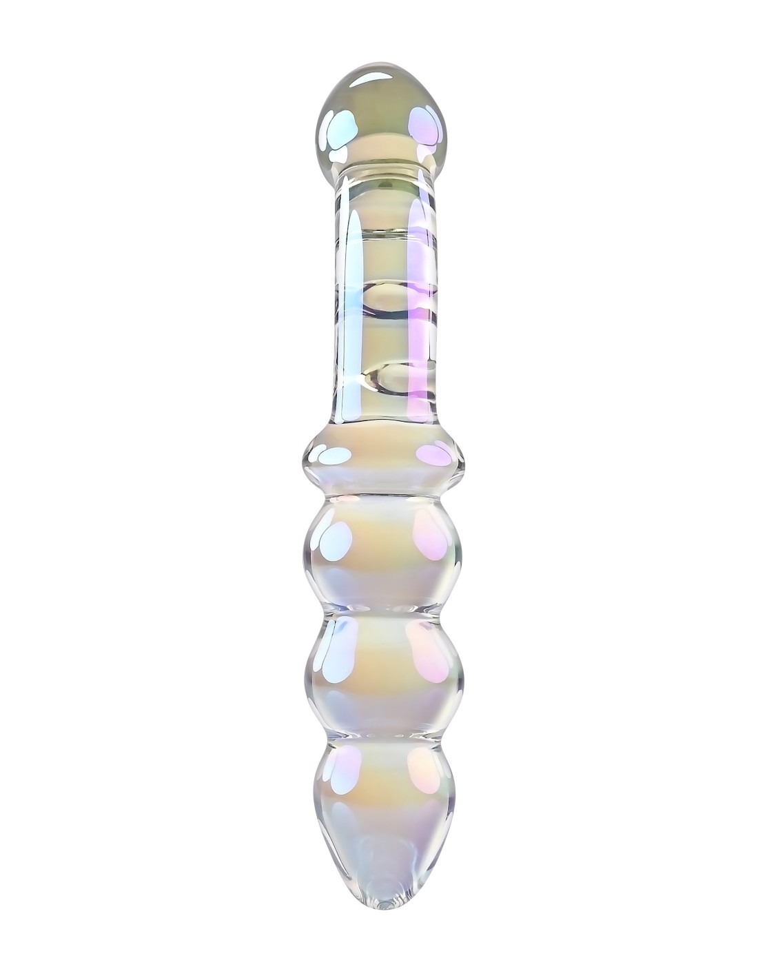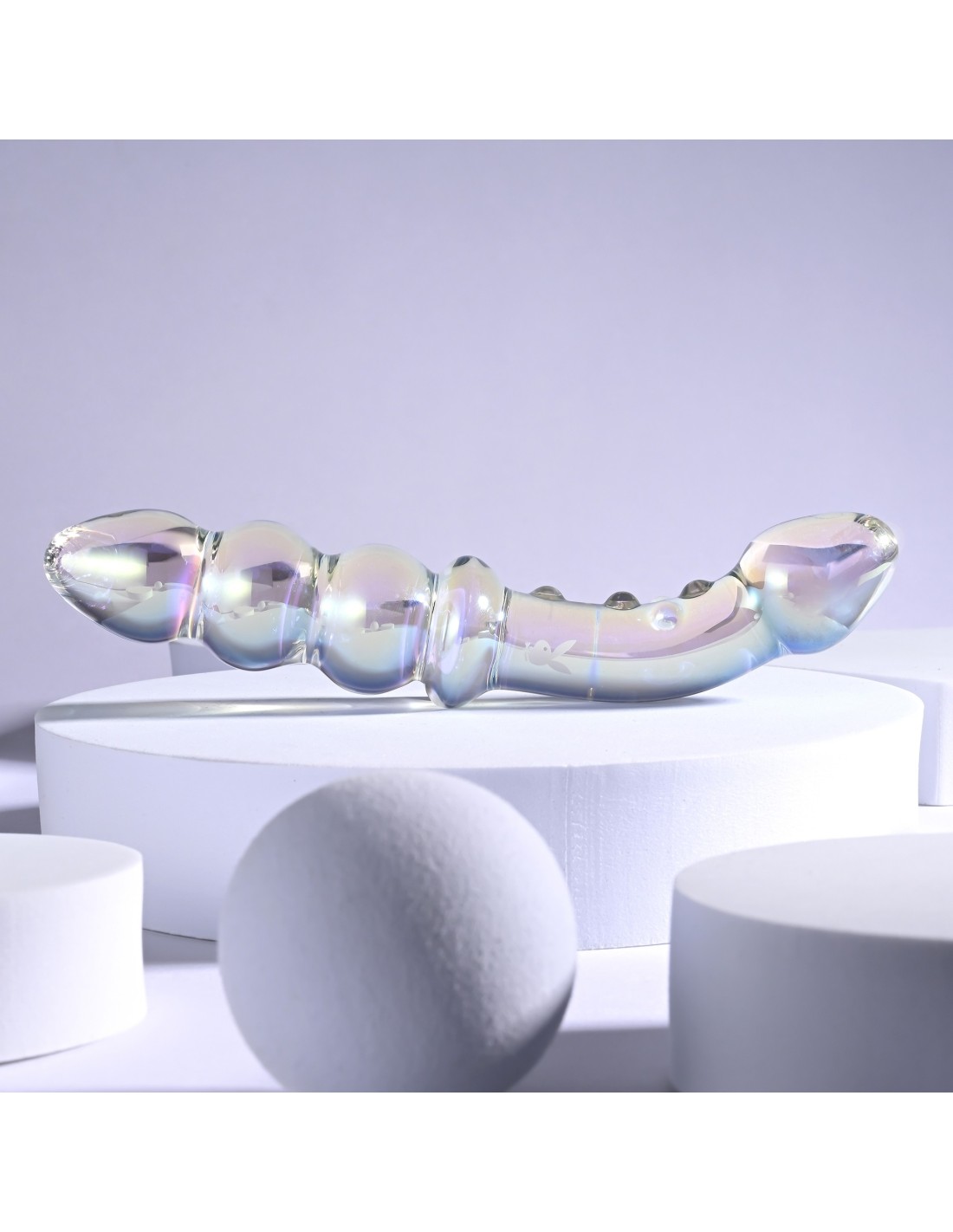Introducing the Jewels collection, destined to be a favorite in your sex toy drawer. Jewels Double is a treasure trove of pleasure possibilities. One end features a curved and textured shaft with a tapered head for vibrant G-Spot and P-Spot stimulation. Flip the toy over and experience a row of chunky beads that are perfect for vaginal or anal play. Made of body-safe borosilicate glass, this Multi Play toy shimmers with a rainbow crystal iridescent finish and the iconic Rabbit Head Design adorns the shaft. Enjoy temperature play by immersing the toy in warm or cool water before use.