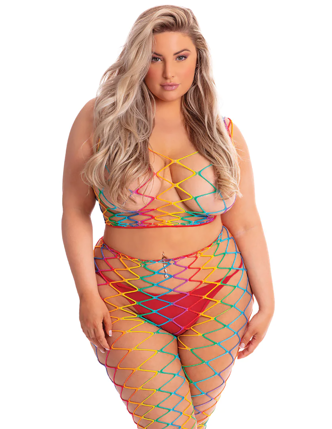 Este juego de 2 piezas está hecho de tela de rejilla en colores brillantes del arcoíris con grandes aberturas. Cuenta con un top corto y un legging.