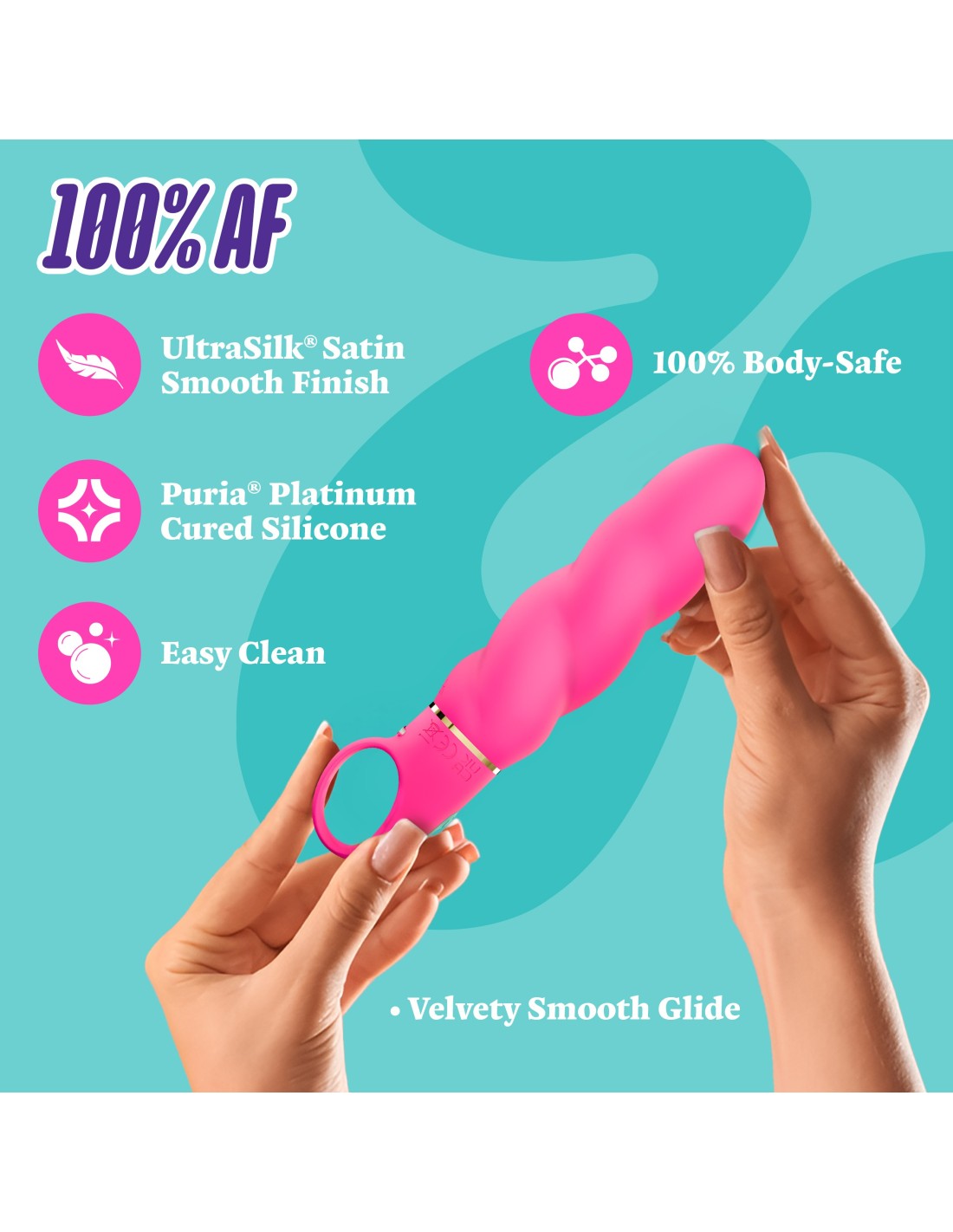 Beautiful and powerful, meet the Aria® Amazing AF. Featuring Blush’s signature RumboTech™ technology, this gorgeous vibrator offers 10 deep, rumbly vibration modes (5 Speeds & 5 Patterns), for a satisfying, full-body experience. The spiral-textured shaft adds visual appeal and smooth sensation, while the rounded head promotes deep, comfortable G-spot pleasure. The easy-grip loop handle provides comfort and control during every session, whether you're playing solo or with a partner. Crafted from Puria® platinum-cured silicone wrapped in UltraSilk®, Amazing AF is smooth, 100% body-safe, and feels amazing against the skin. It’s IPX7 waterproof for bath or shower play, and with magnetic USB charging, it’s always ready to deliver an experience that’s Amazing AF. Embrace the power of Aria!