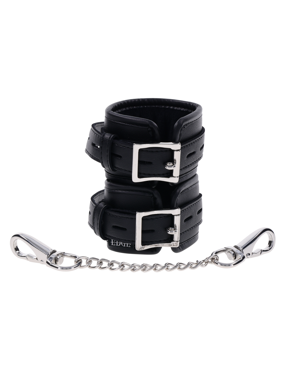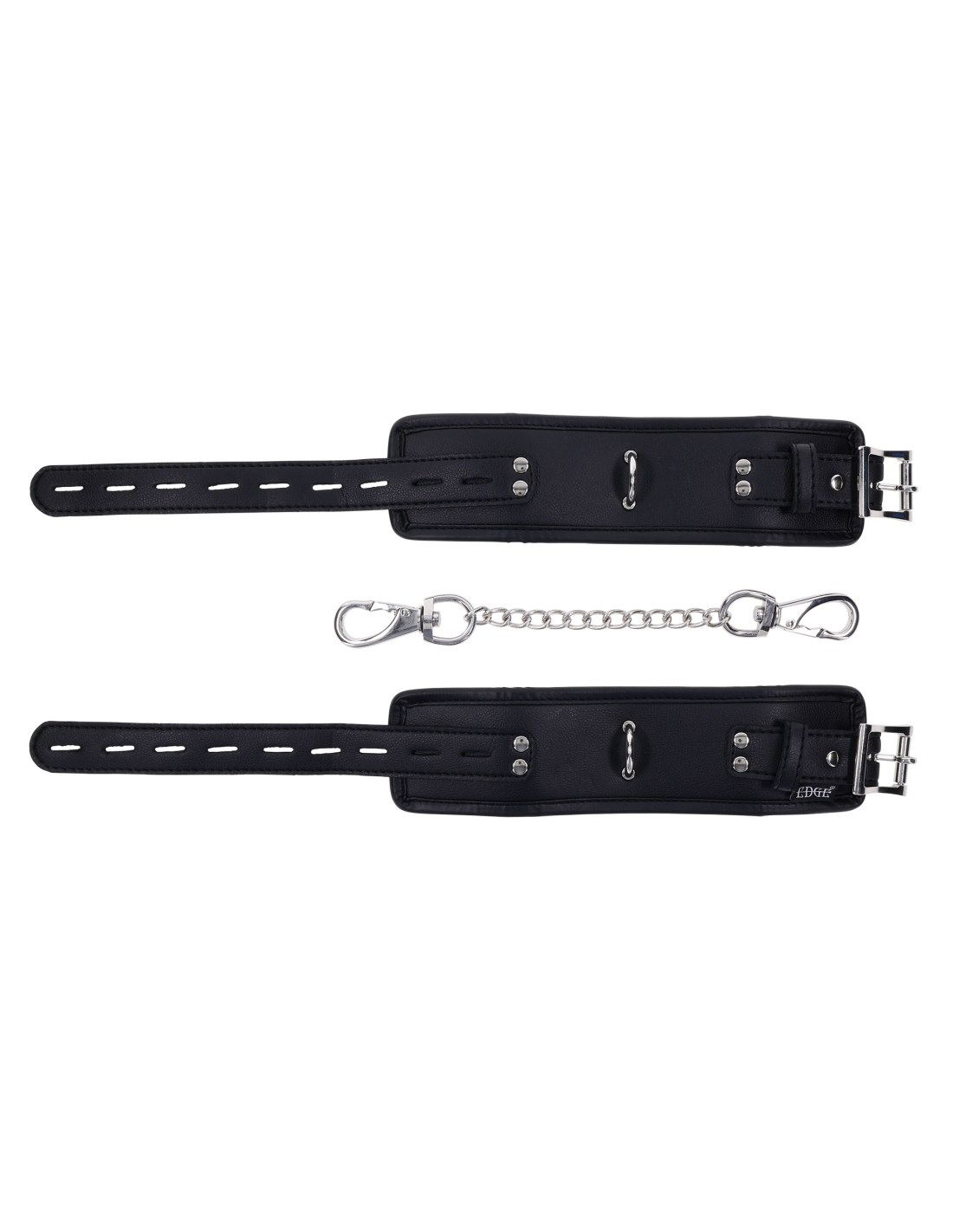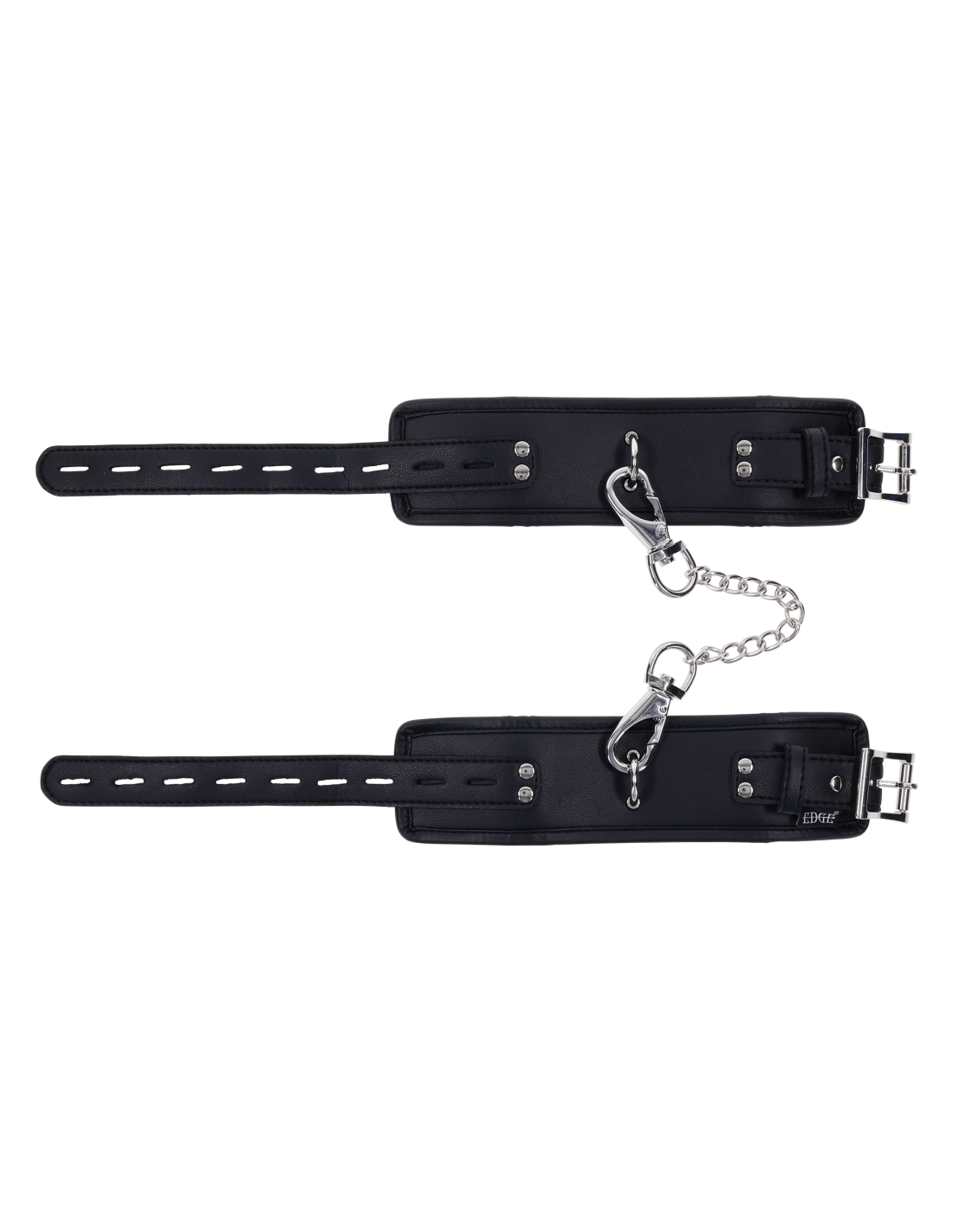 Take control with the Edge® Handcuffs, the perfect complement to your power play. These matching black cuffs are padded for comfort and durability, designed for extended wear and secure restraint. Featuring sleek silver metal hardware and reinforced stitching, they’re built to withstand even the most intense sessions. The adjustable buckle closure ensures a customizable fit, while a sturdy rings allow for versatile attachment to other restraints or bondage gear. Whether you're a seasoned pro or a curious beginner, the Edge® Handcuffs offer a perfect balance of comfort and control.