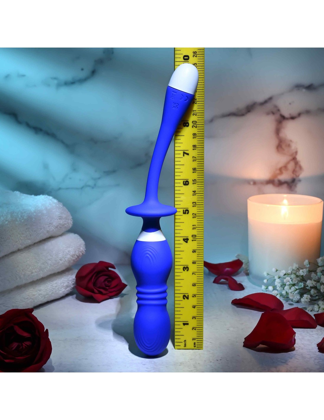 ¡Experimente la sensación salvaje de dos orbes bulbosos con un puente de empuje entre ellos! Redondeada en la punta, la primera esfera se estrecha hasta formar un eje telescópico de acordeón que se asienta en la segunda bola. El juguete descansa sobre una amplia base de seguridad seguida de un mango delgado y muy flexible que puedes doblar hasta 90 grados para una mejor navegación y más posibilidades. Quita la tapa inferior para conectar este juguete único directamente a tu dispositivo o cargador de pared y llévalo bajo el agua de forma segura, ya que es completamente sumergible.