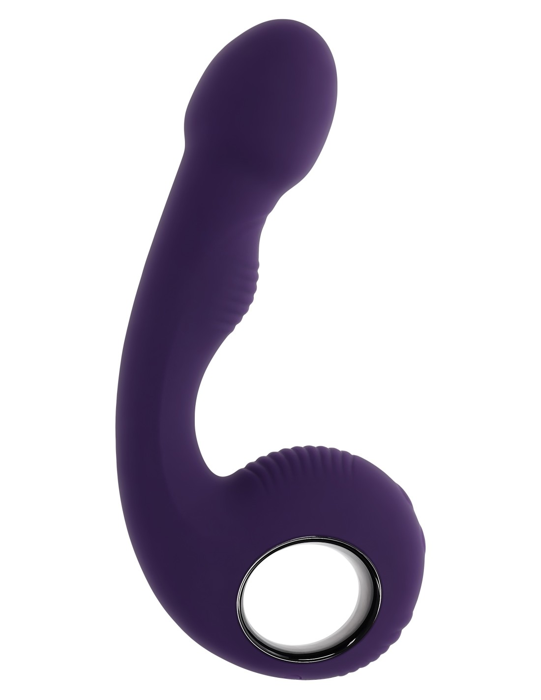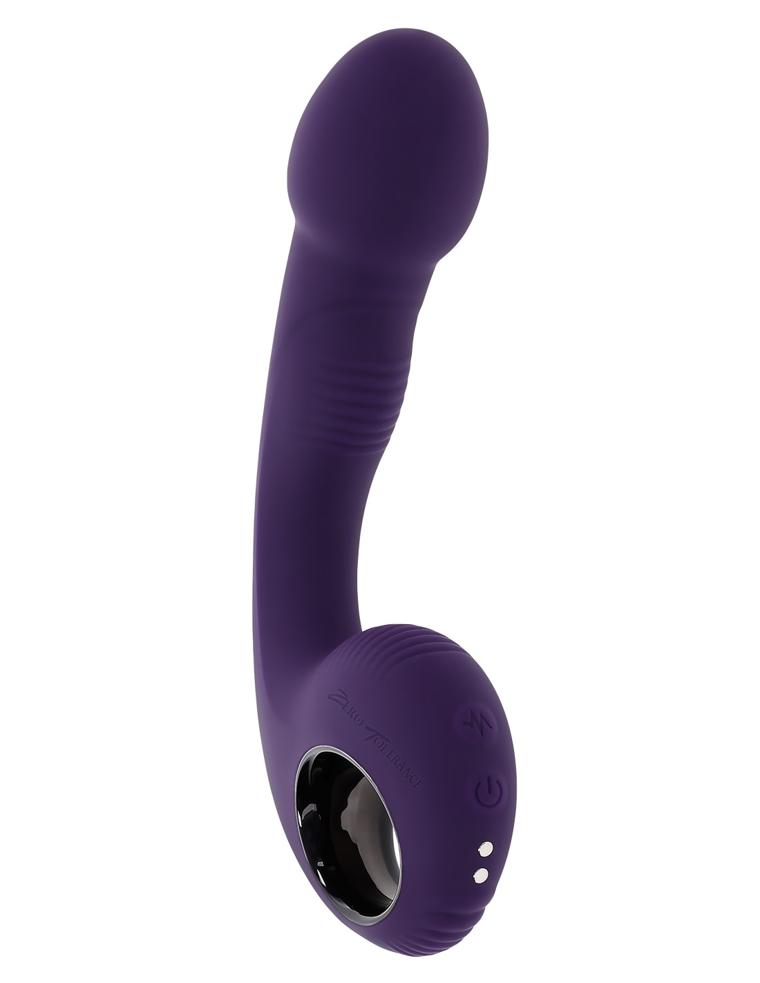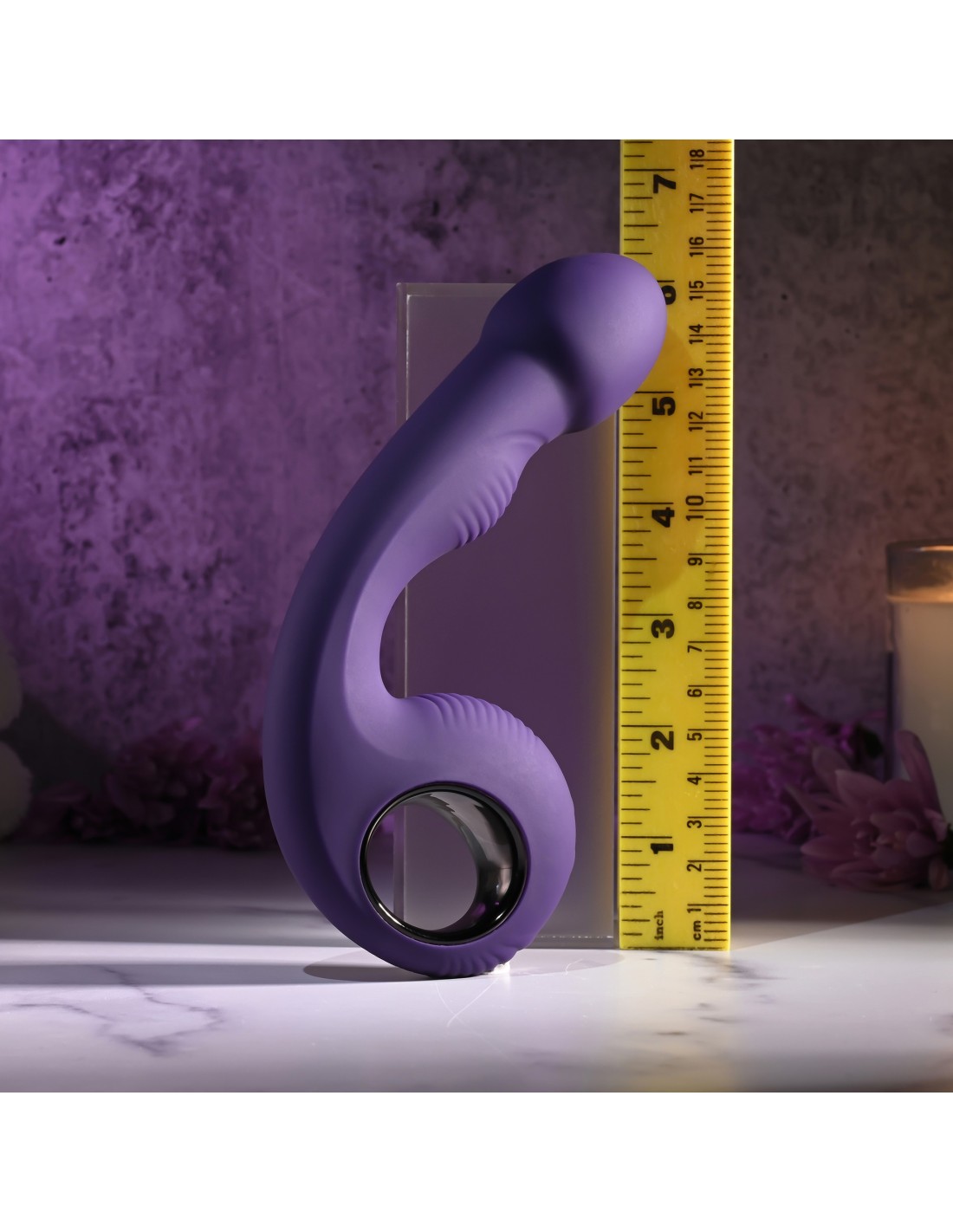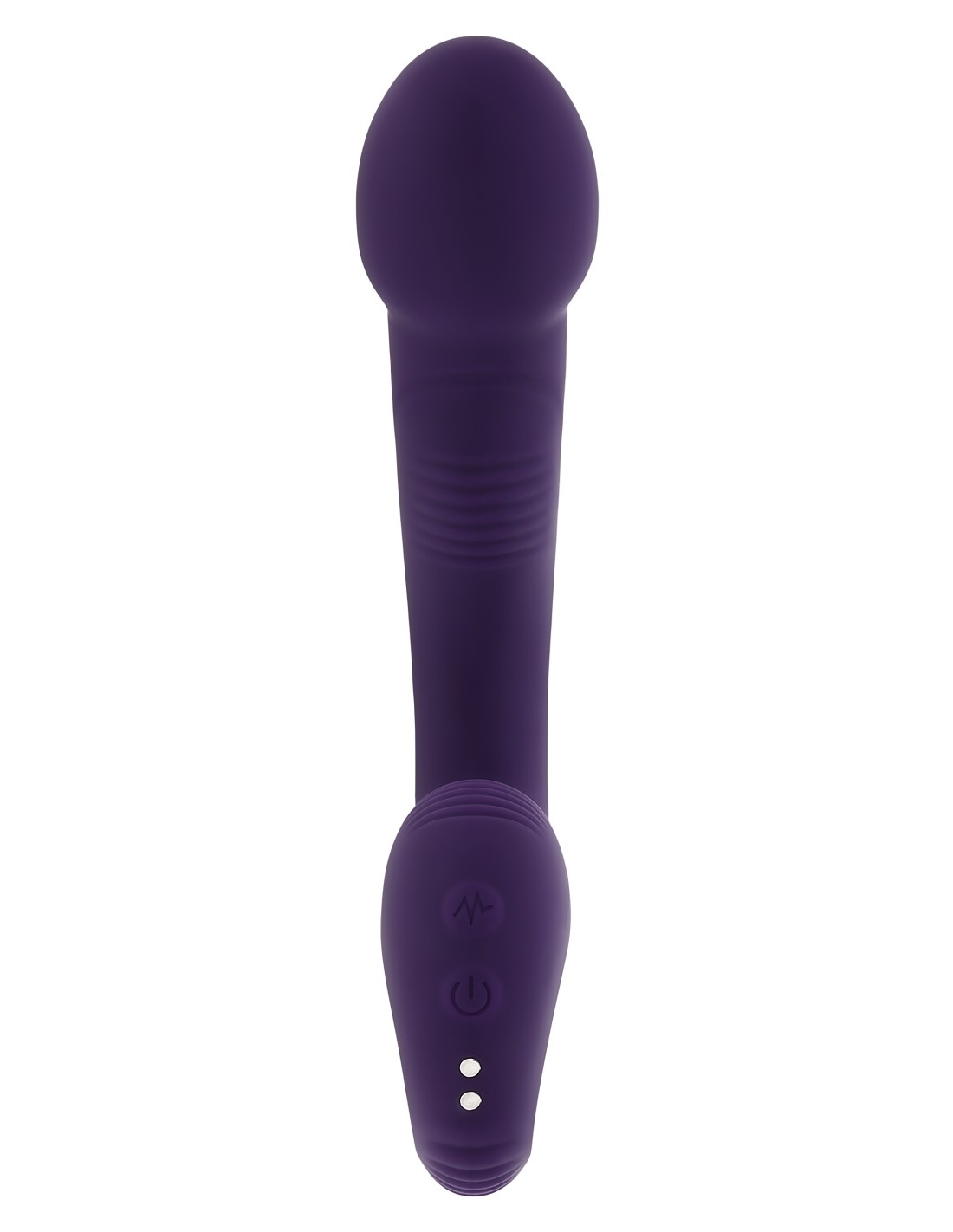 This powerful vibrator features a textured, ringed handle for comfortable navigation with a firm grip. Two independently controlled motors deliver multi-speed vibrations in both the bulbous crowned head and the ringed safety base, which is flexible at the stem to move with the body.