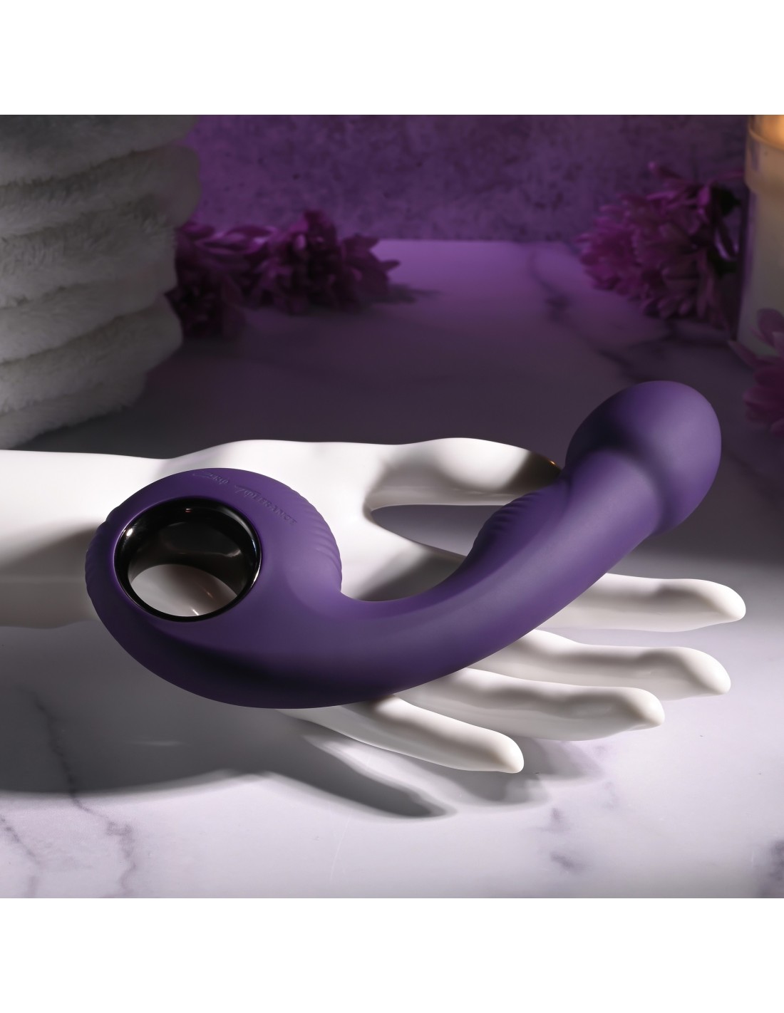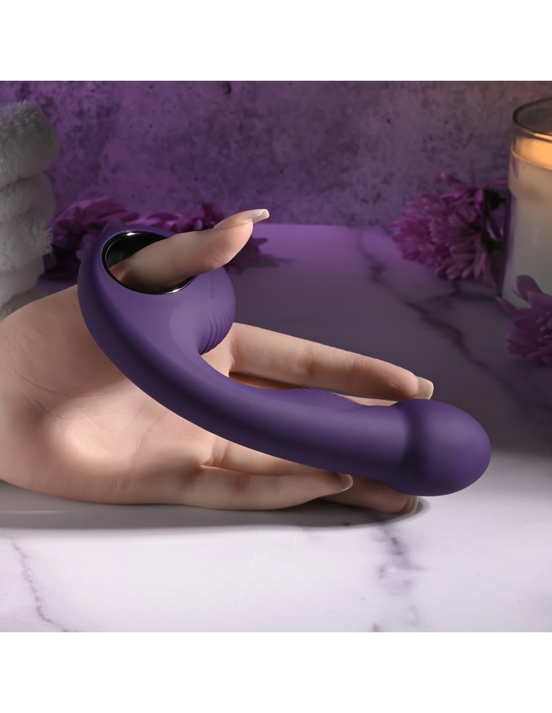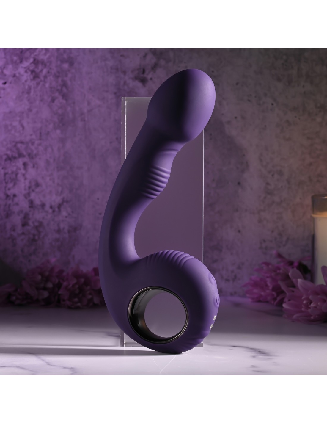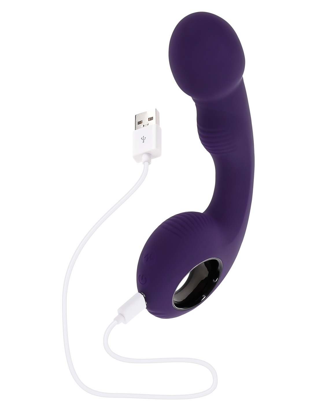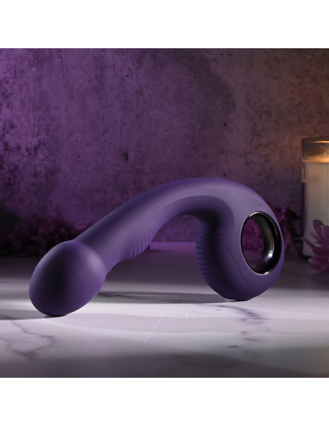 This powerful vibrator features a textured, ringed handle for comfortable navigation with a firm grip. Two independently controlled motors deliver multi-speed vibrations in both the bulbous crowned head and the ringed safety base, which is flexible at the stem to move with the body.