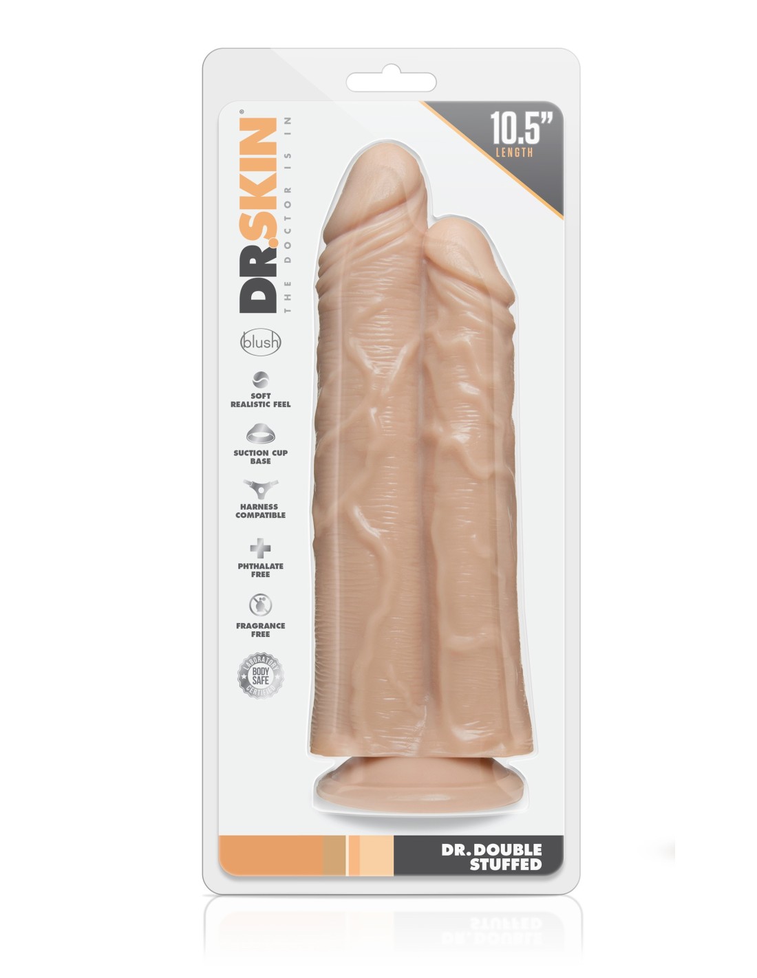 ¡El médico está dentro! El Dr. Skin Doble Relleno te hará creer que dos son mejores que uno. Este consolador realista con ventosa cuenta con dos ejes conectados para una experiencia de llenado suprema. Double Trouble está esculpido para incluir todas las venas, crestas y textura de la piel de una polla real, ¡multiplicada por dos! Pega la resistente ventosa a cualquier superficie lisa y plana y disfruta de un paseo con las manos libres. Hecho de PVC no poroso, Double Pregnant es seguro para el cuerpo y no contiene ftalatos.