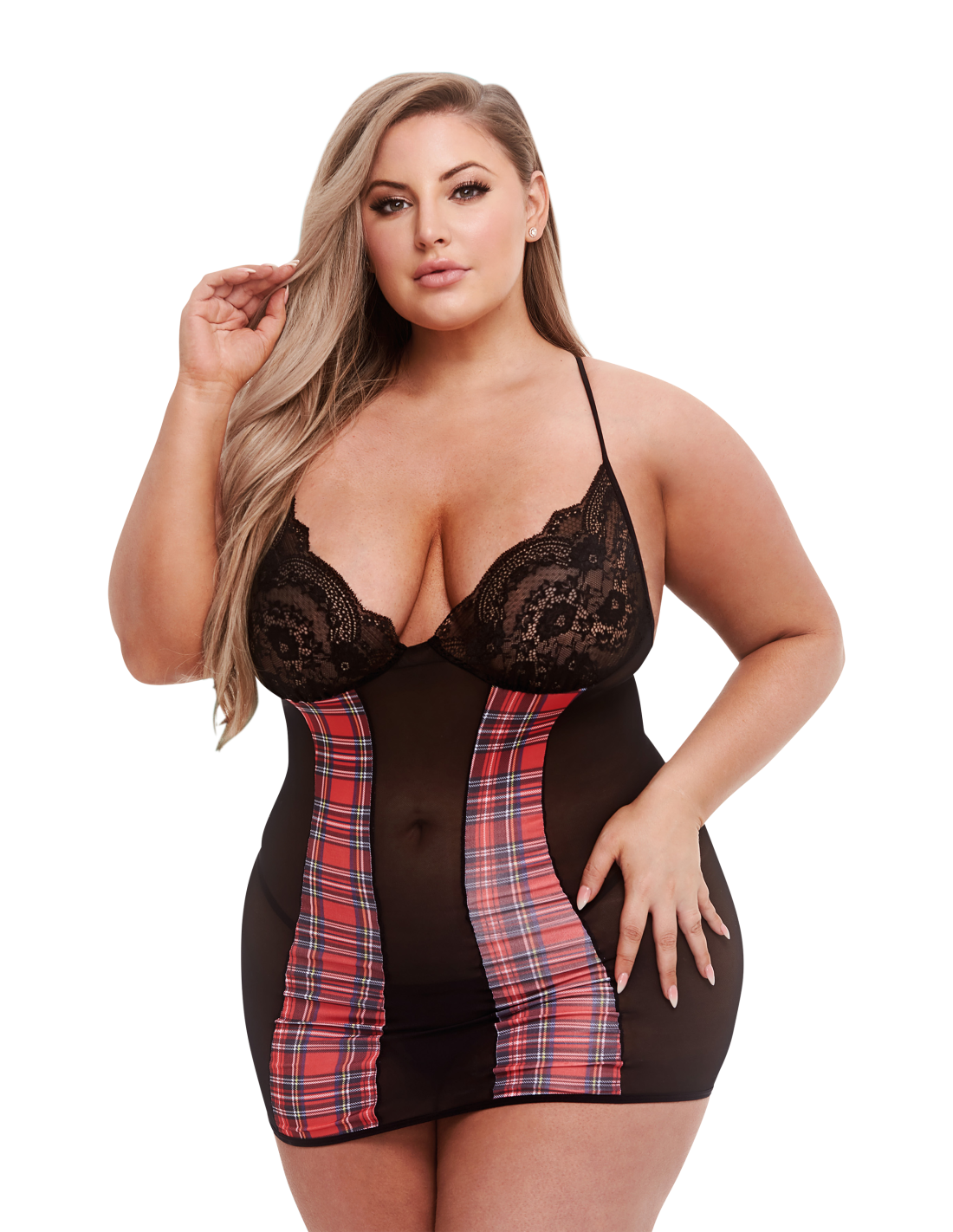 ¡Cuadros, encaje y transparencias por todos lados! ¡Esta sensual camisola está cuidadosamente diseñada para hacer que todos tus activos destaquen! Las copas transparentes de encaje lo mantienen romántico, mientras que un body negro transparente, diseñado con detalles de coquetos cuadros, realza el atractivo sexual de una colegiala. Con tiras ajustables en la parte trasera. Incluye tanga a juego.
