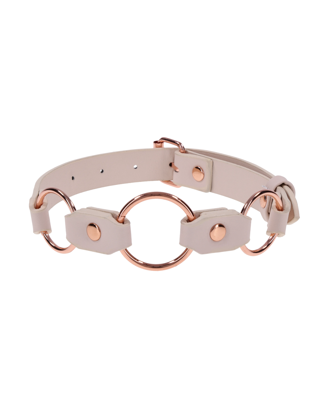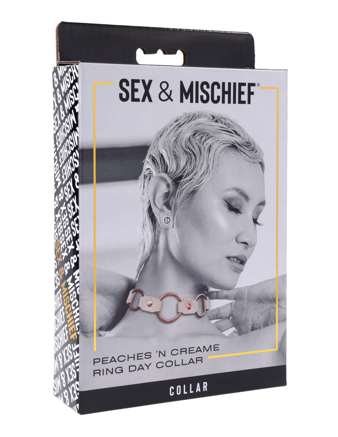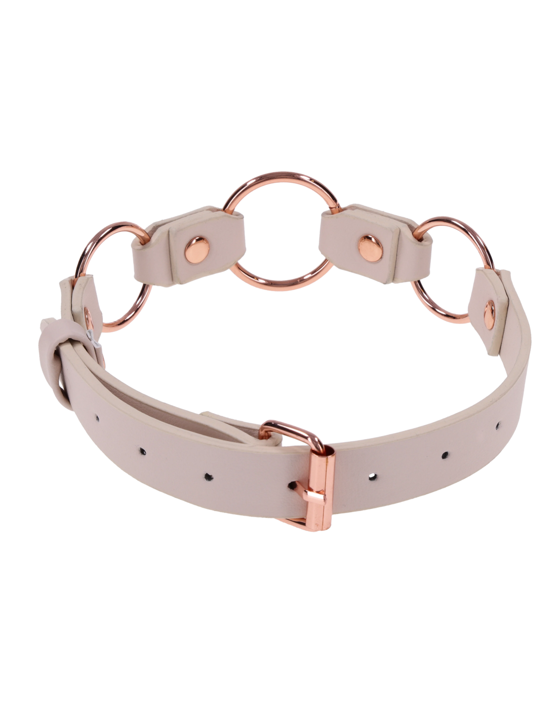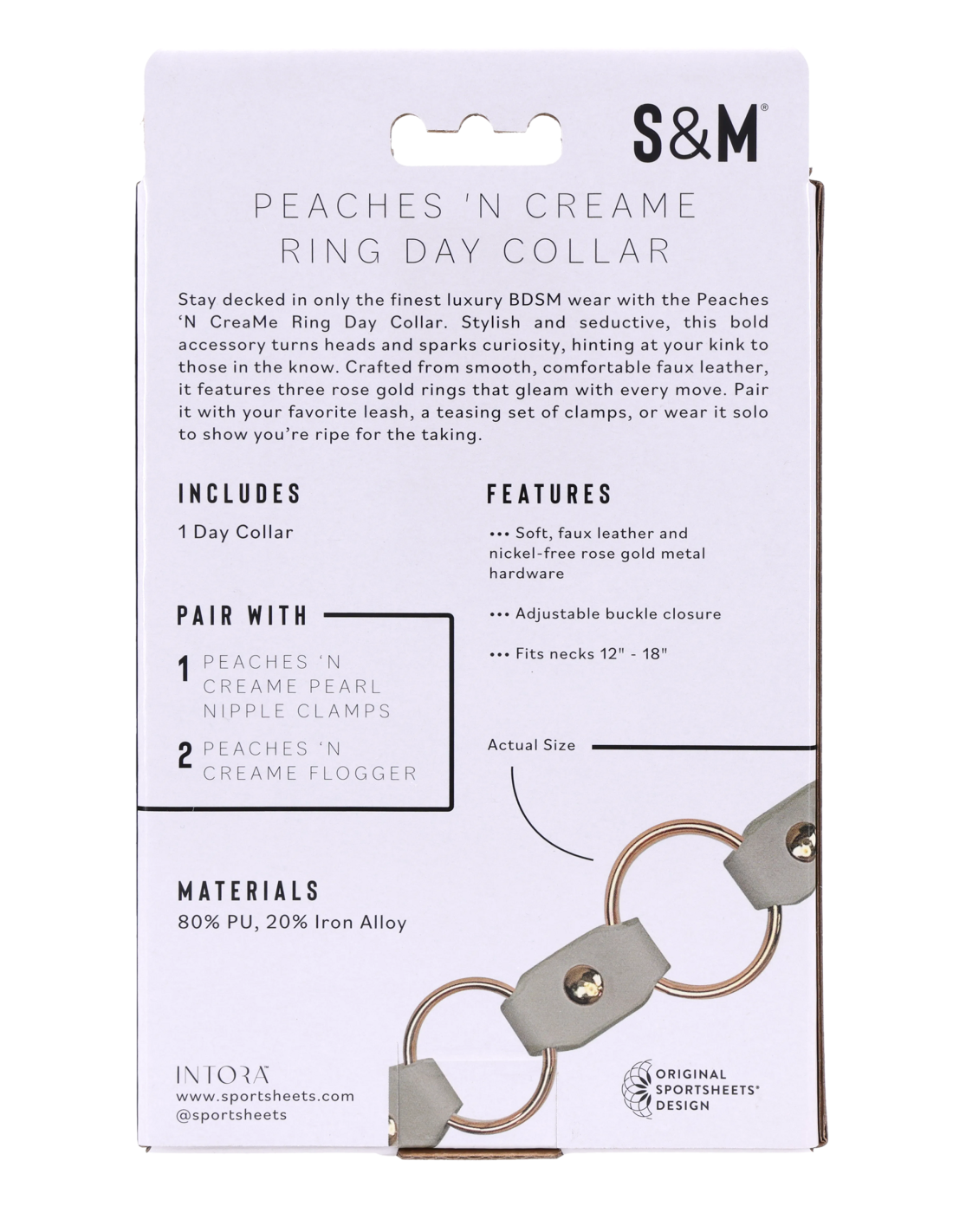 Stay decked in only the finest luxury BDSM wear with the Peaches‘N CreaMe Ring Day Collar. Stylish and seductive, this bold accessory turns heads and sparks curiosity, hinting at your kink to those in the know. Crafted from smooth, comfortable faux leather, it features three rose gold rings that gleam with every move. Pair it with your favorite leash, a teasing set of clamps, or wear it solo to show you’re ripe for the taking.