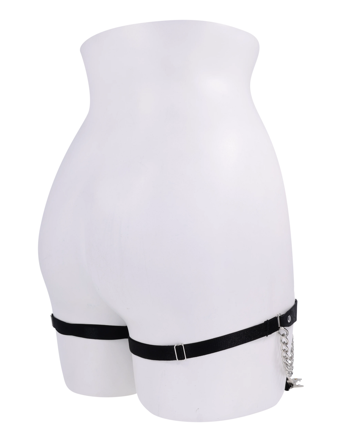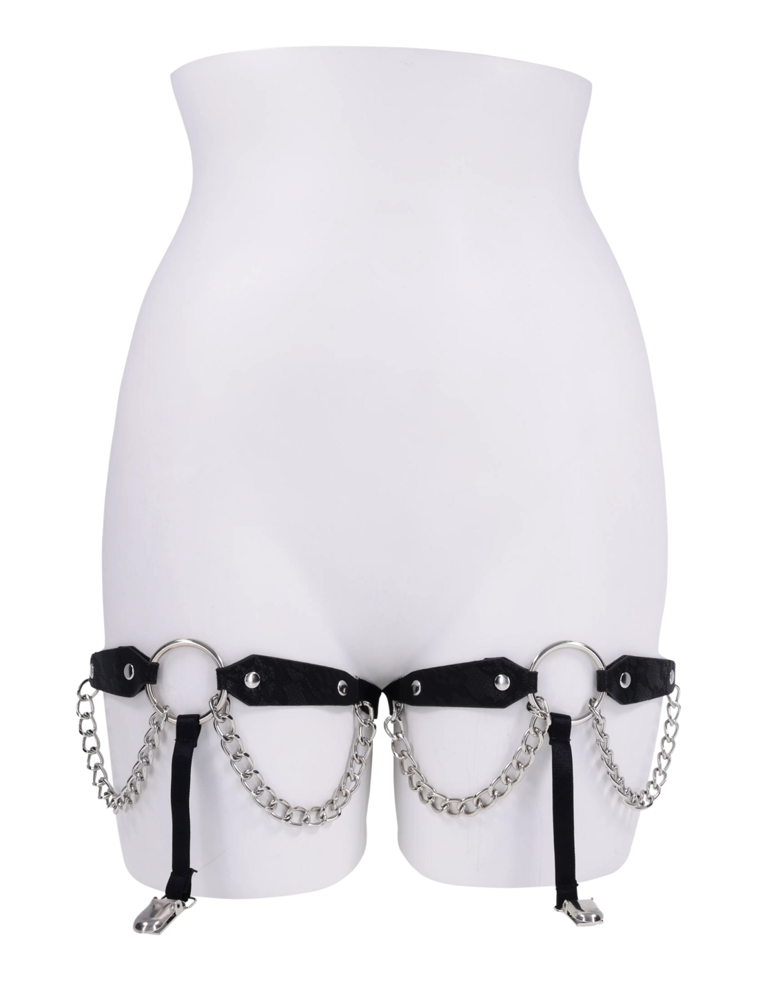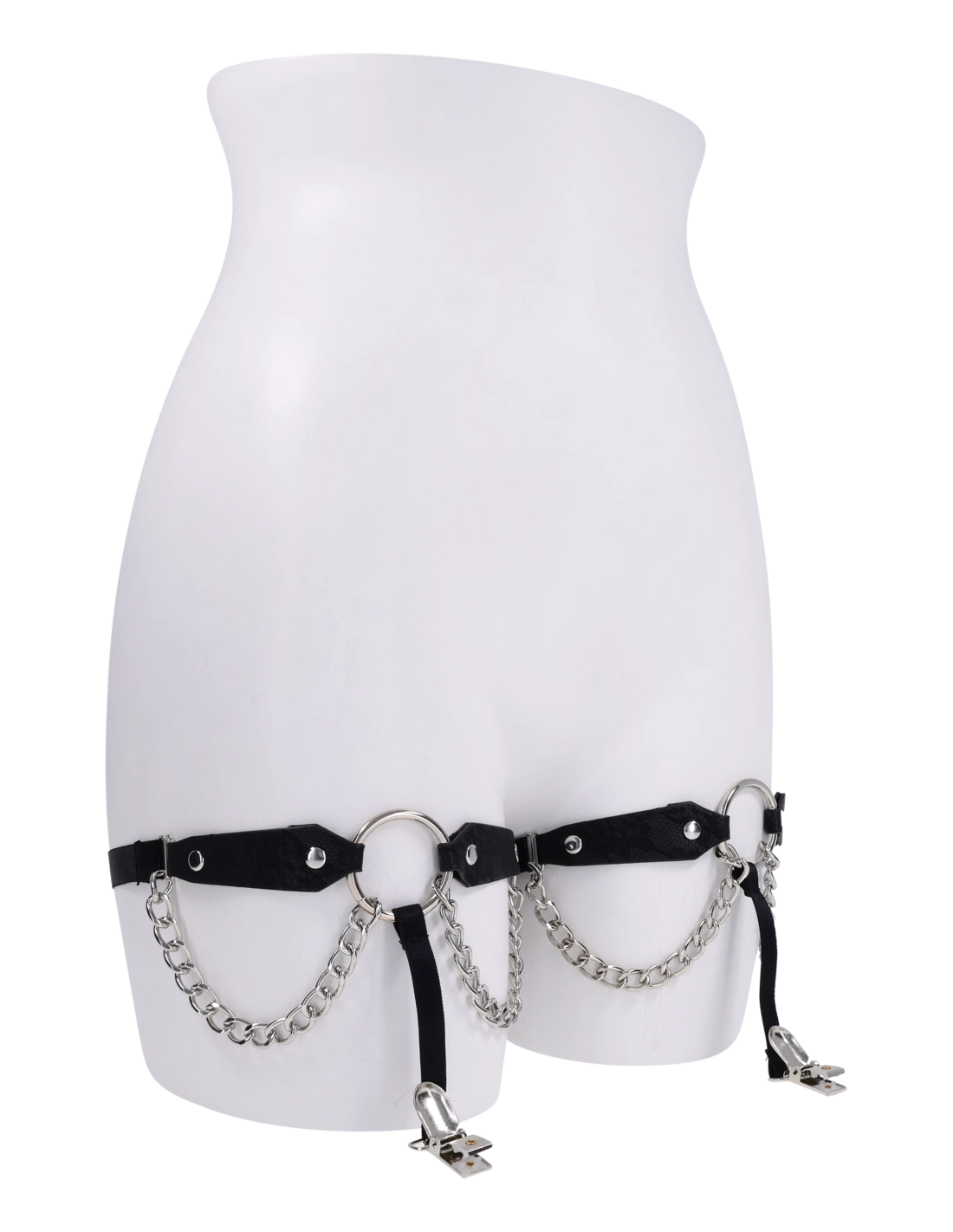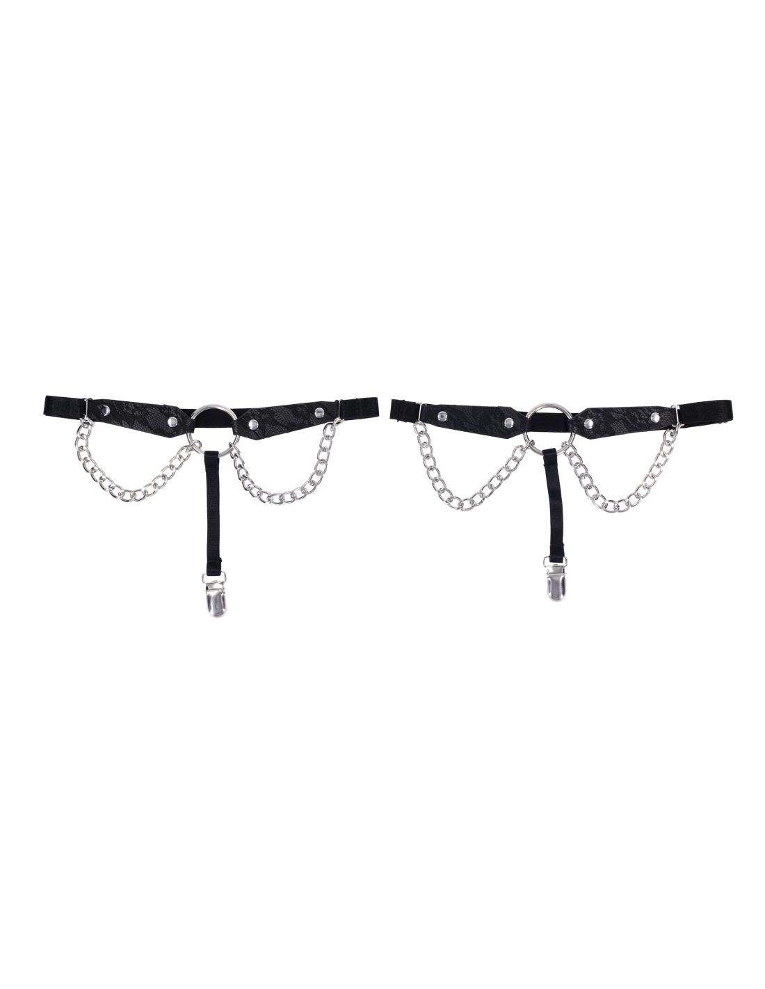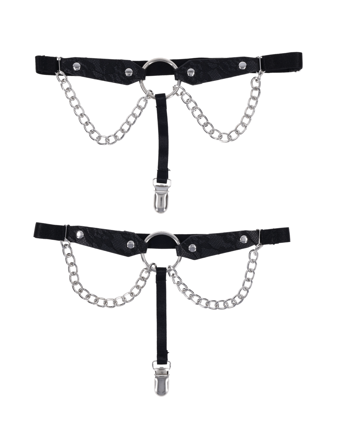 Elevate your look with this stunning pair of garters, where bold allure meets sophisticated elegance. Crafted from lace-etched faux leather, these garters exude sensuality while maintaining a refined edge. A striking metal ring at the center adds a touch of boldness. Draped chains cascade effortlessly, enhancing the design with a sultry yet sophisticated touch. Designed for both style and function, a secure clip ensures your thigh-high stockings stay perfectly in place. Whether you're dressing to impress or indulging in intimate moments, these garters are the perfect balance of daring and elegance.