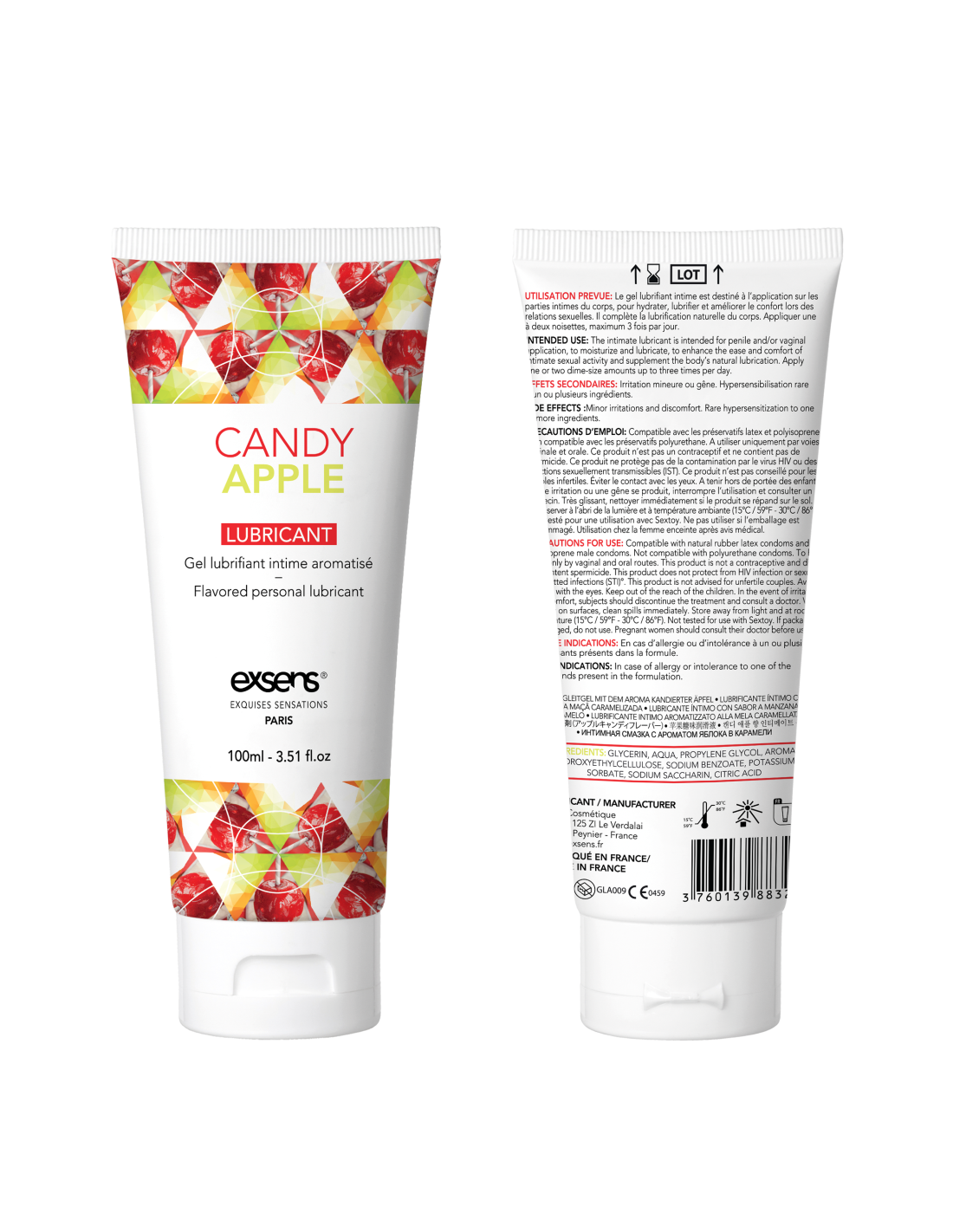 Los 3 lubricantes a base de agua de Exsens vienen con sabor Candy Apple, con extracto de Aloe Vera ecológico y con sabor a Frambuesa. Los geles lubricantes tienen excelentes propiedades deslizantes, no son pegajosos y son aptos para uso vaginal. Los lubricantes son compatibles con condones de látex y poliisopropeno.