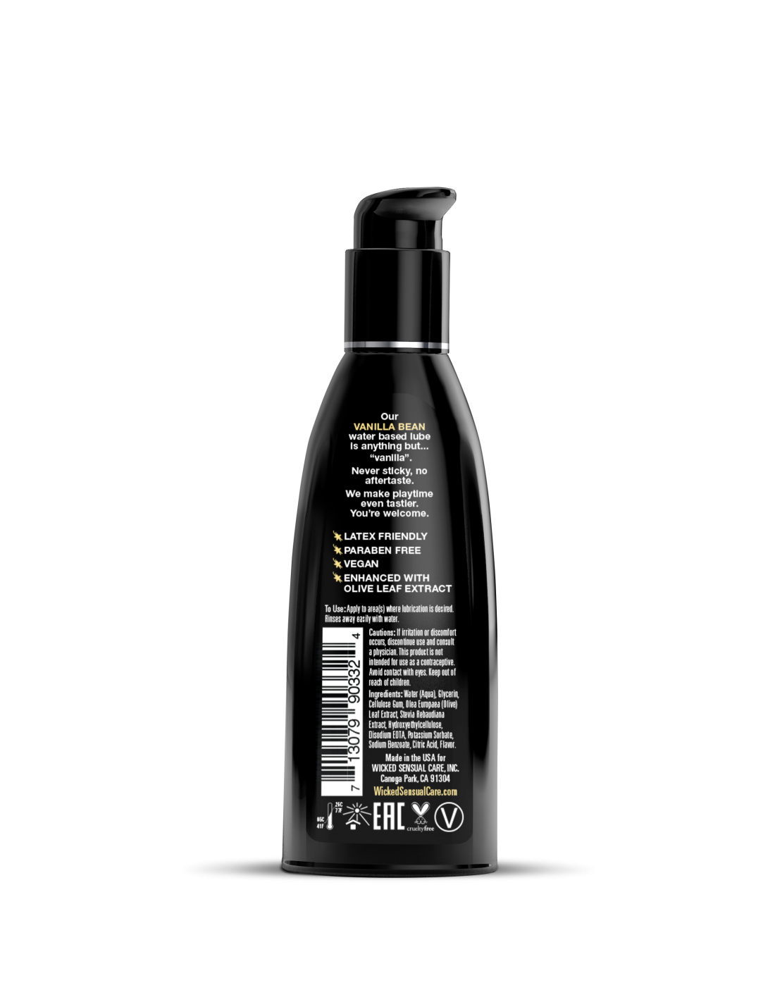 ¡Disfruta de la dulzura del lubricante de vainilla! El lubricante personal Wicked Aqua Vanilla Bean, besable, lamible y delicioso, agrega sabores naturales sutiles y deliciosos para mejorar los placeres orales. Ligera y sedosa, esta fórmula a base de agua es la combinación sensual perfecta de un lubricante elegante y una sensación de sabor. Nunca pegajoso y sin regusto, Wicked Aqua Vanilla Bean satisface tu gusto por lo dulce y tus deseos íntimos, todo en un increíble producto de placer. El sexo oral nunca supo tan bien. Ya sea que estés dando o recibiendo, los sabores Wicked te darán una nueva confianza sexy. Los lubricantes con sabor Wicked están endulzados con Stevia, lo que los hace seguros para el juego oral, vaginal y anal.