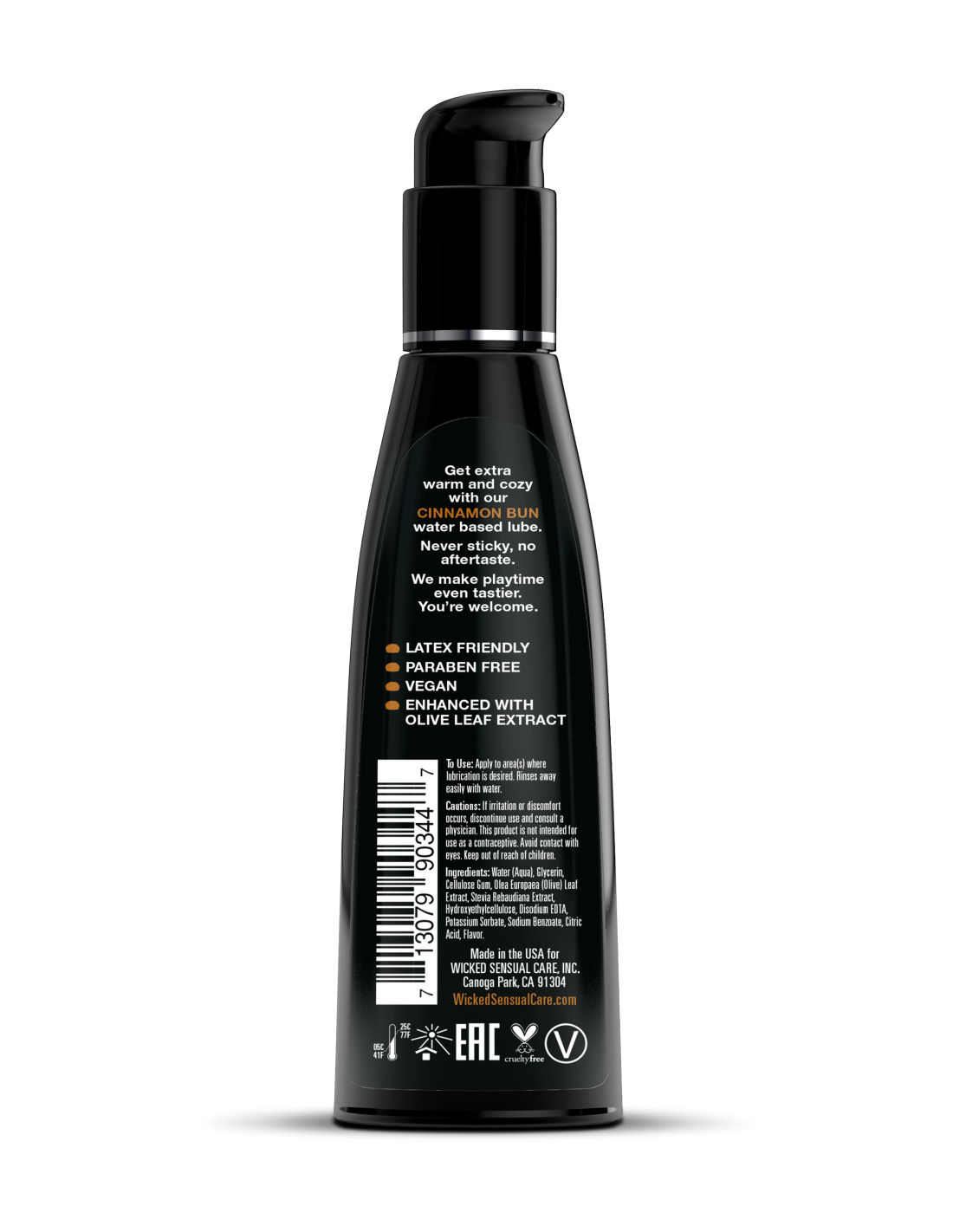 ¡Tan delicioso que pensarías que es real! El lubricante personal Wicked Aqua Cinnamon Bun agrega sabores naturales sutiles y deliciosos para mejorar los placeres orales. Ligera y sedosa, esta fórmula a base de agua es la combinación sensual perfecta de un lubricante elegante y una sensación de sabor. Nunca pegajoso y sin regusto, Wicked Aqua Cinnamon Bun satisface tu gusto por lo dulce y tus deseos íntimos, todo en un increíble producto de placer. El sexo oral nunca supo tan bien. Ya sea que estés dando o recibiendo, los sabores Wicked te darán una nueva confianza sexy. Los lubricantes con sabor Wicked están endulzados con Stevia, lo que los hace seguros para el juego oral, vaginal y anal.