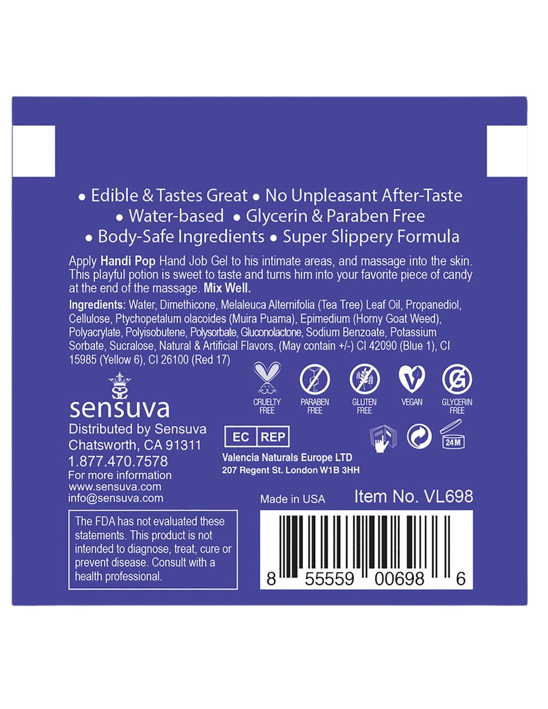 Let your hands work their magic to give him a hand massage he will never forget. HandiPop was created to give him an ultra slippery extra long handjob and at the end of the massage you can turn him into your favorite lollipop because this playful potion tastes absolutely amazing. It will be a pleasure for both of you.
