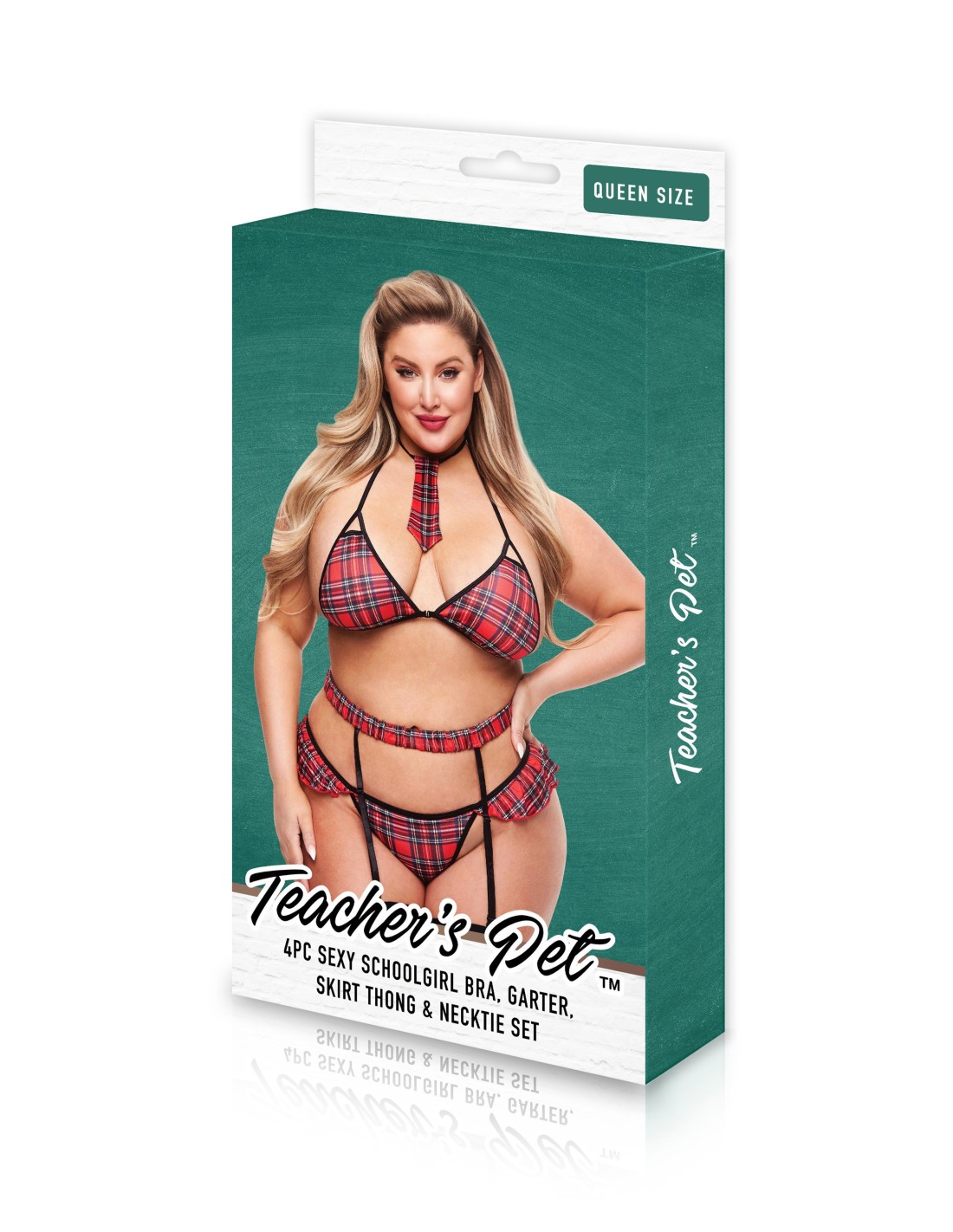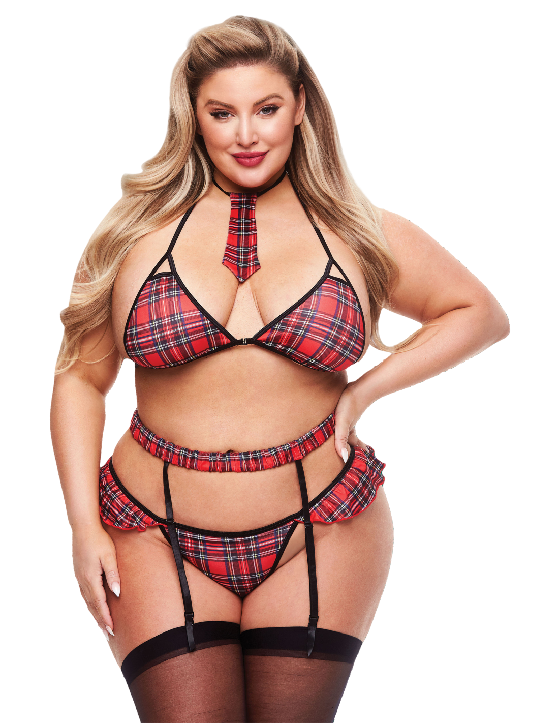 ¡La clase está en sesión con este juego de cuatro piezas! Un sostén elegante combina con una liga a juego que se coloca justo sobre el ombligo. Y la tanga no es una tanga cualquiera, con una falda adjunta para mostrar esa sensualidad. ¡Termina el look con una gargantilla y todos te rogarán que te quedes después de la escuela!