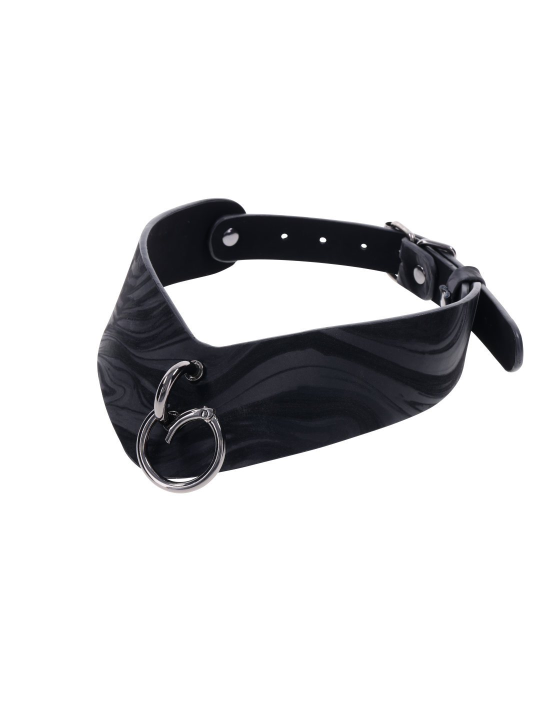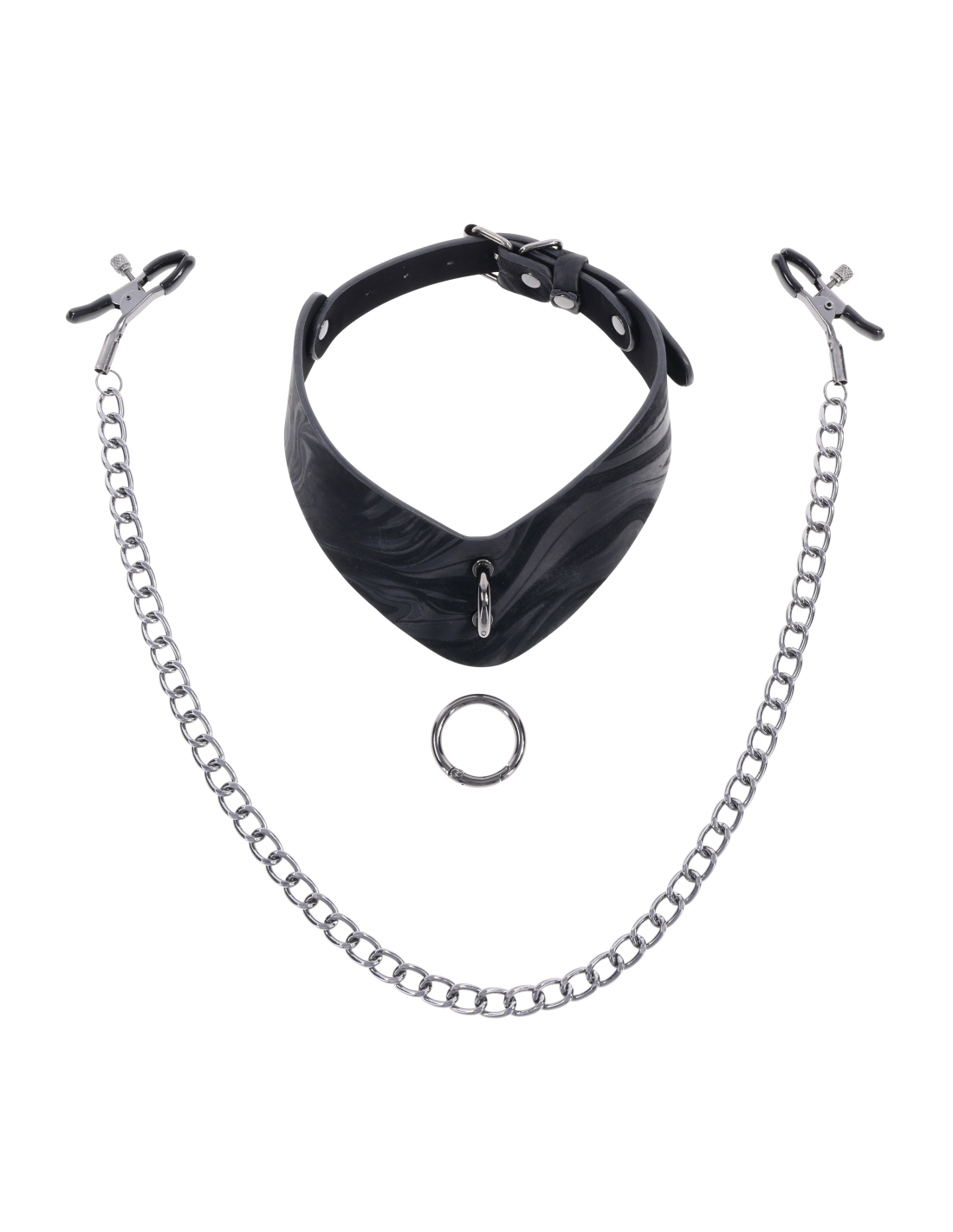 Elevate your scenes with the elegant dominance of the Velvet Noir Collar with Nipple Clamps. Crafted from smooth faux leather with a sleek marbled finish, this angled collar commands attention and control. Hematite-plated hardware, including a removable ring, offers both sophistication and functionality. A single metal chain connects to adjustable nipple clamps, adding a teasing element that can be removed for even more versatility. Use the collar with the clamps, swap in a leash, or wear it solo as a stylish day collar. Designed for both comfort and exploration, this piece invites you to play with power on your terms.