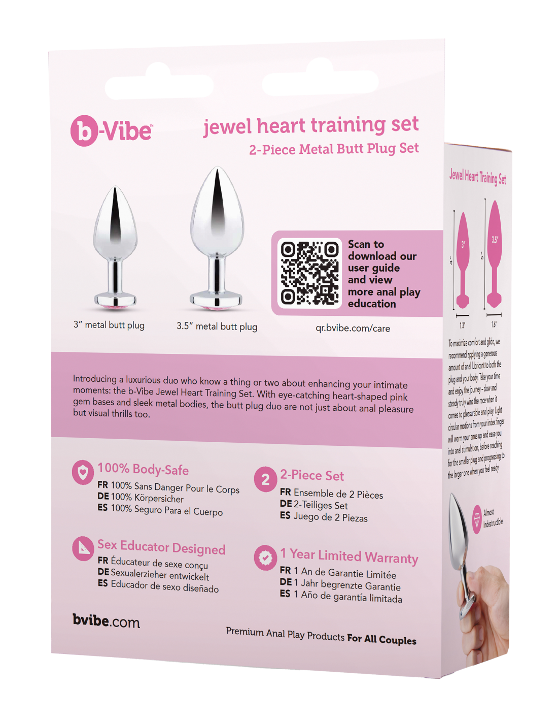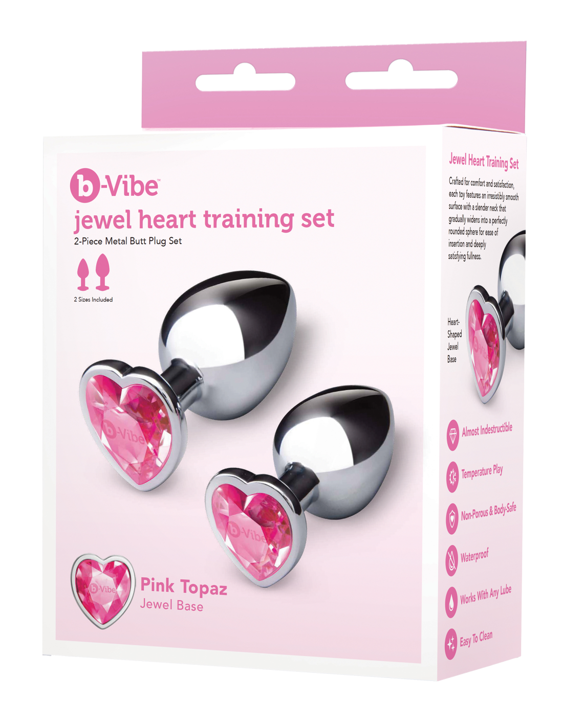Introducing a luxurious duo who know a thing or two about enhancing your intimate moments: the b-Vibe Jewel Heart Metal Butt Plug Training Set. Witheye-catching heart-shaped pink gem bases and sleek metal bodies, the butt plug duo are not just about anal pleasure but visual thrills too.