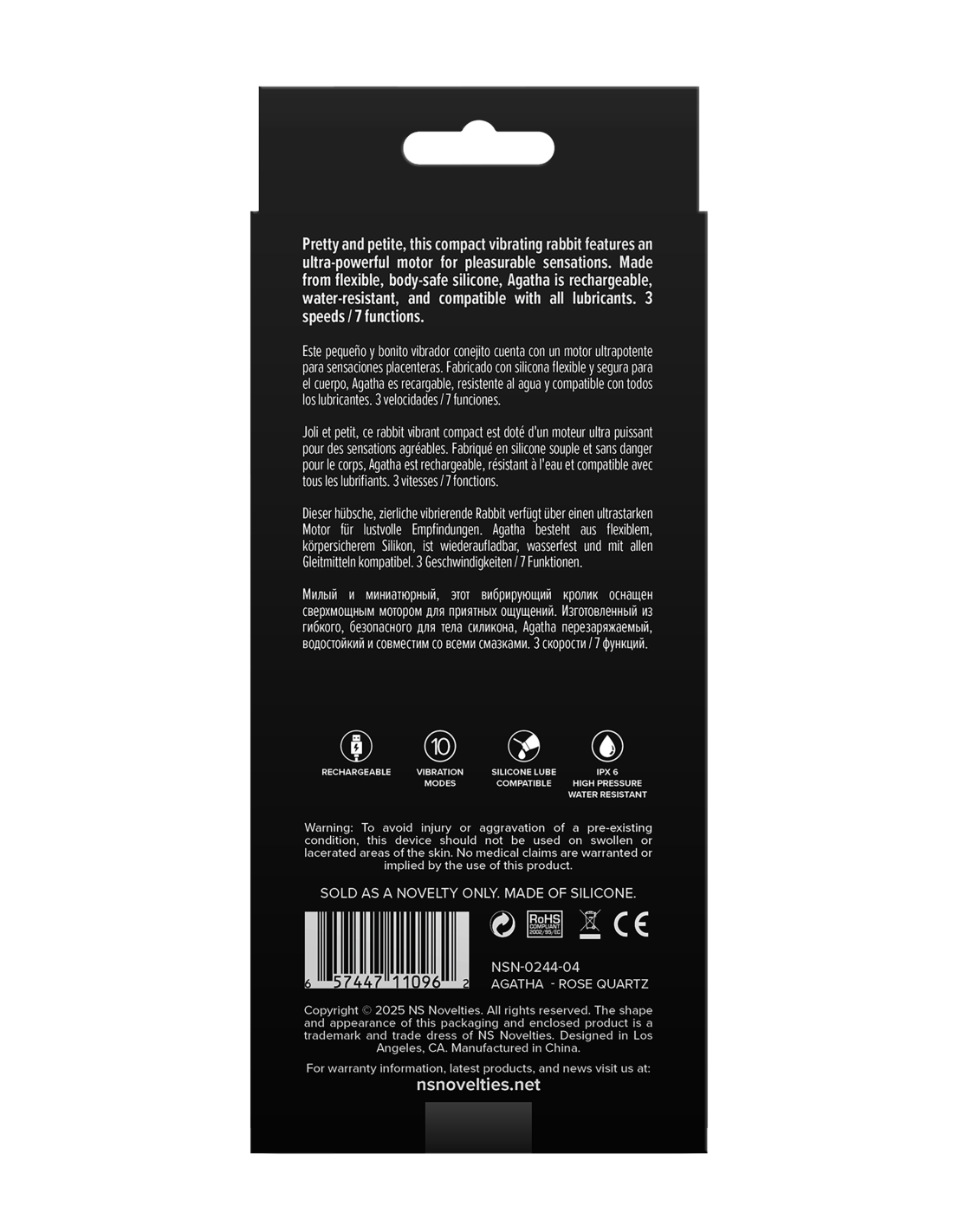 Pretty and petite, this compact vibrating rabbit features an ultra-powerful motor for pleasurable sensations. Made from flexible, body-safe silicone, Agatha is rechargeable, water-resistant, and compatible with all lubricants.