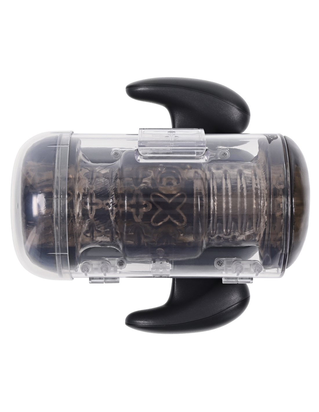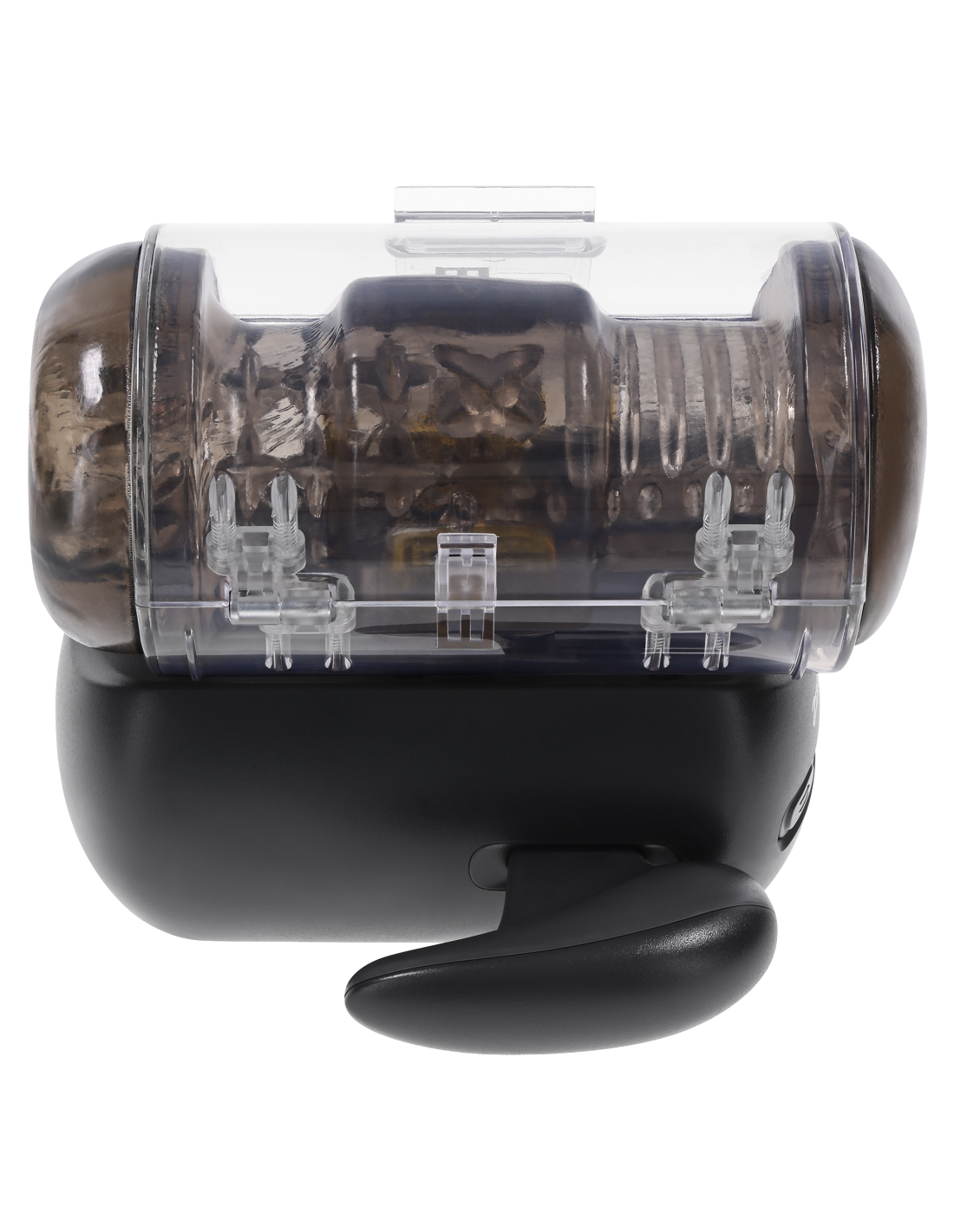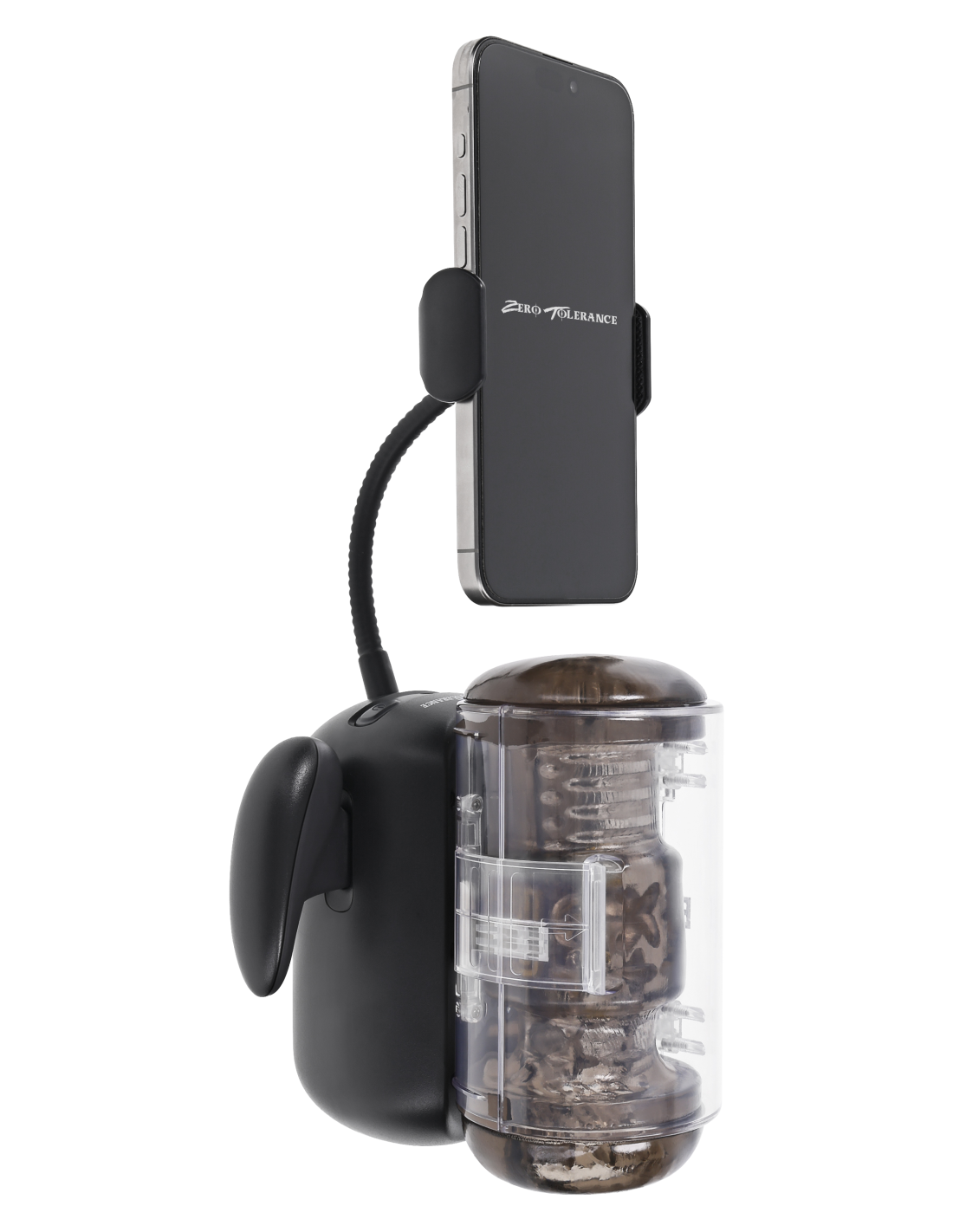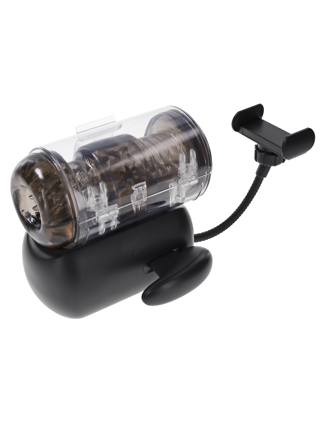 This unique vibrating, heated stroker thrusts in multiple speeds to keep up with your wildest fantasy. Get a comfortable grip on the gaming-style handles on either side while you watch a complimentary erotic movie on your phone that conveniently attaches to the end of the toy. Let the beaded inner channel surround you with soft yet firm textures that feel just like the real thing – and warm the whole sleeve up with a quick double-click. All motors are controlled separately by a panel you can reach with ease, and the sleeve removes from its magnetic base for quick and easy cleaning.