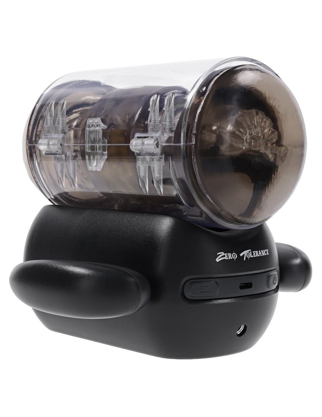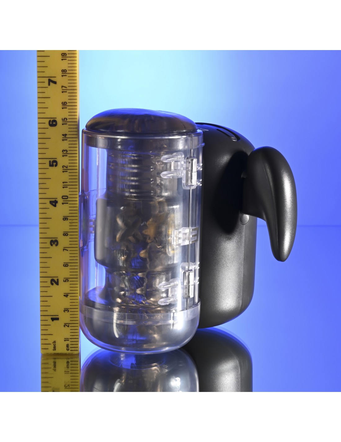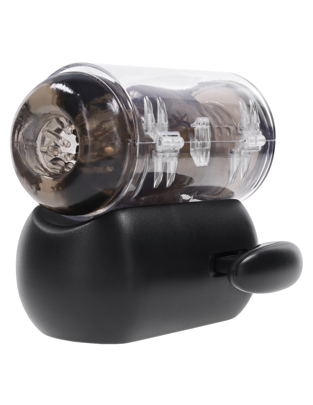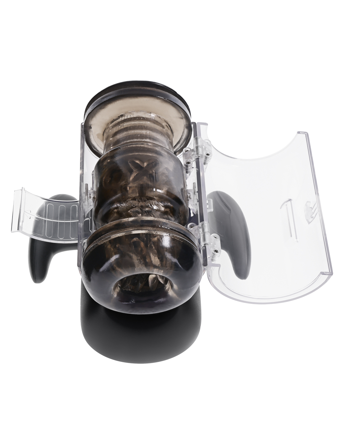 This unique vibrating, heated stroker thrusts in multiple speeds to keep up with your wildest fantasy. Get a comfortable grip on the gaming-style handles on either side while you watch a complimentary erotic movie on your phone that conveniently attaches to the end of the toy. Let the beaded inner channel surround you with soft yet firm textures that feel just like the real thing – and warm the whole sleeve up with a quick double-click. All motors are controlled separately by a panel you can reach with ease, and the sleeve removes from its magnetic base for quick and easy cleaning.