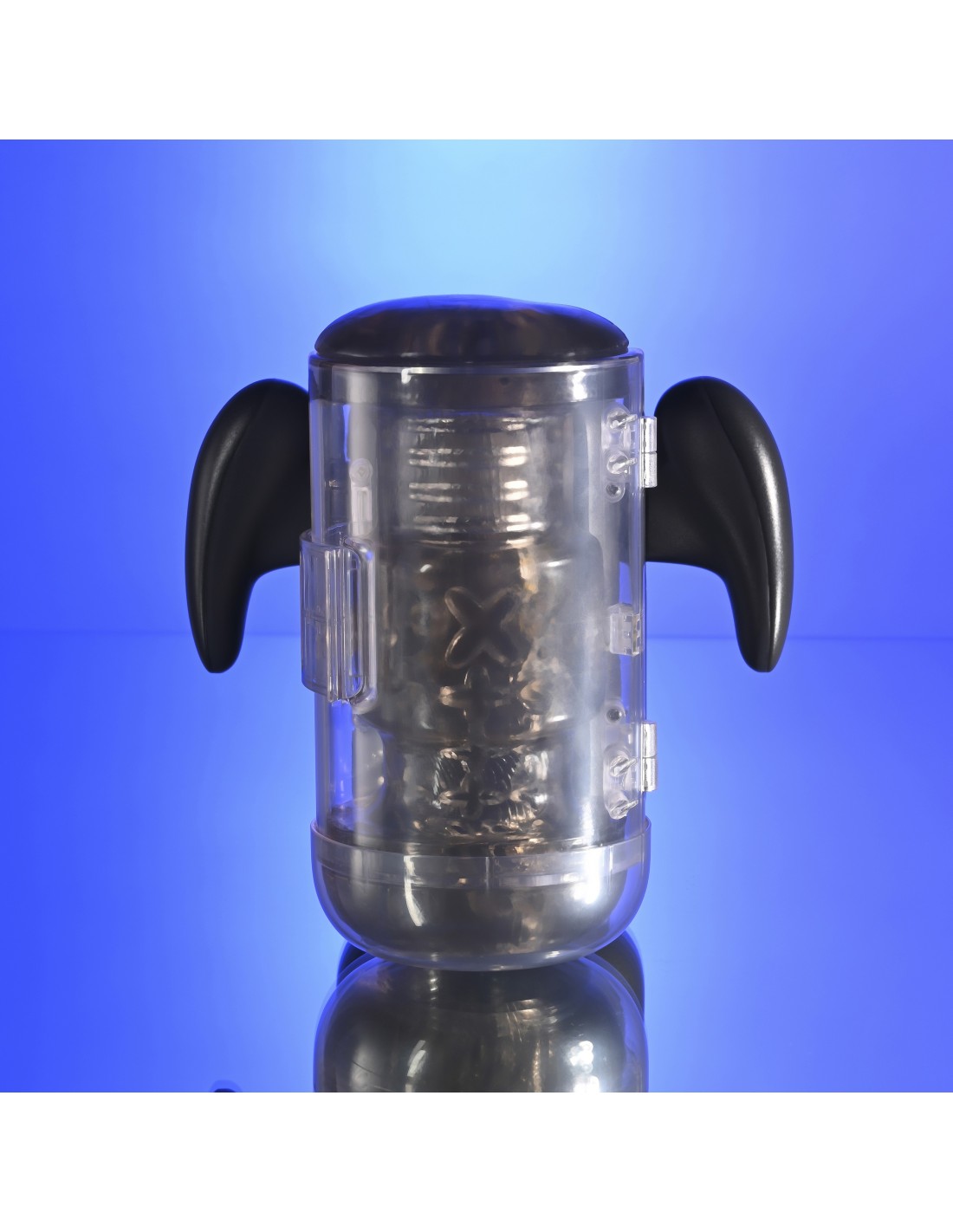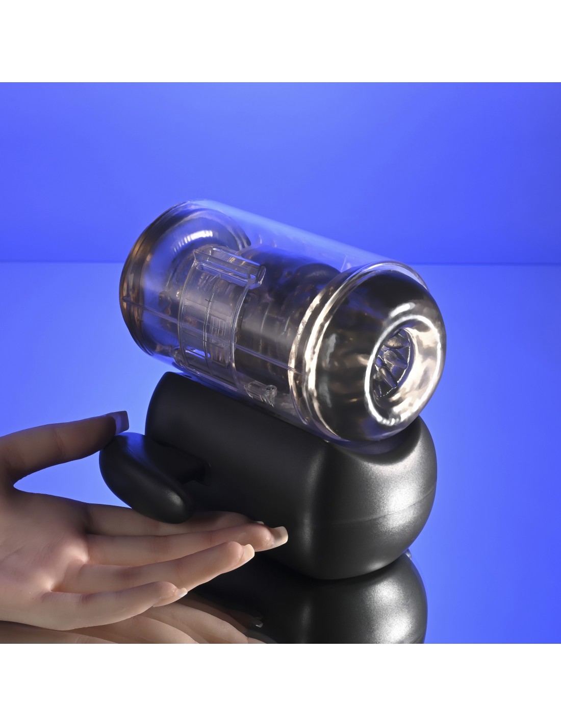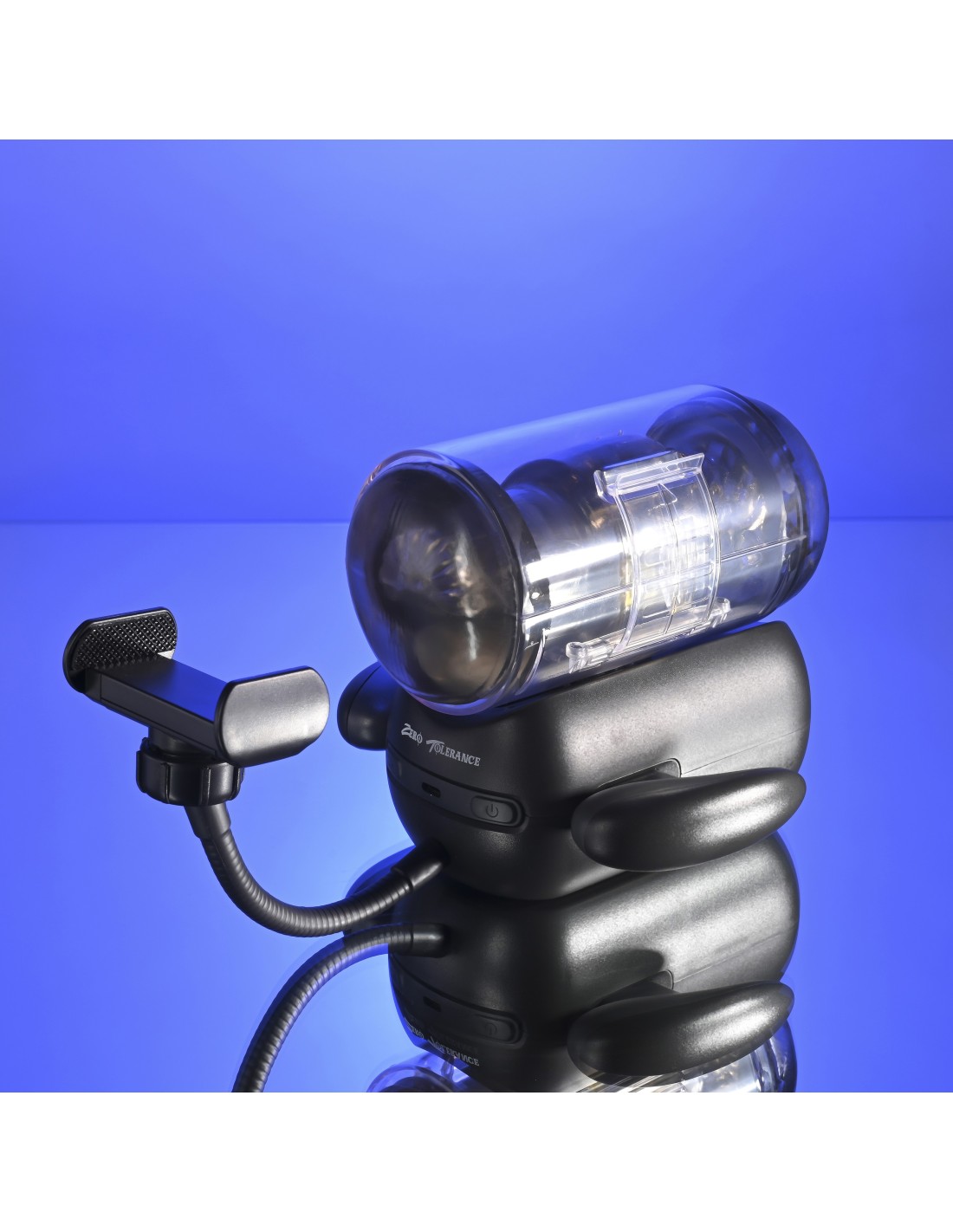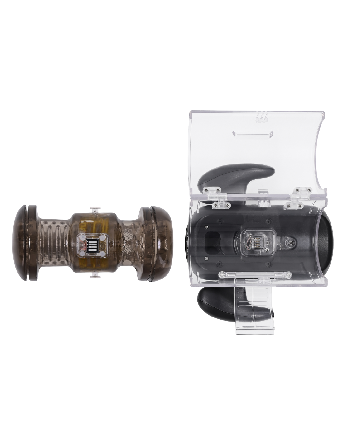This unique vibrating, heated stroker thrusts in multiple speeds to keep up with your wildest fantasy. Get a comfortable grip on the gaming-style handles on either side while you watch a complimentary erotic movie on your phone that conveniently attaches to the end of the toy. Let the beaded inner channel surround you with soft yet firm textures that feel just like the real thing – and warm the whole sleeve up with a quick double-click. All motors are controlled separately by a panel you can reach with ease, and the sleeve removes from its magnetic base for quick and easy cleaning.