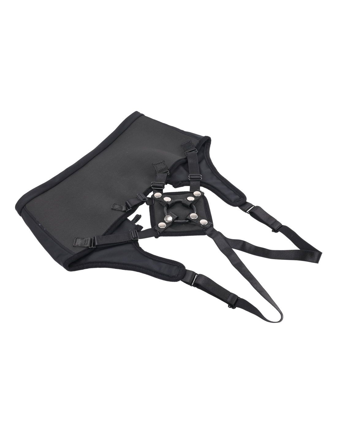 - Six adjustable elastic bands connect front padding for precise dildo placement