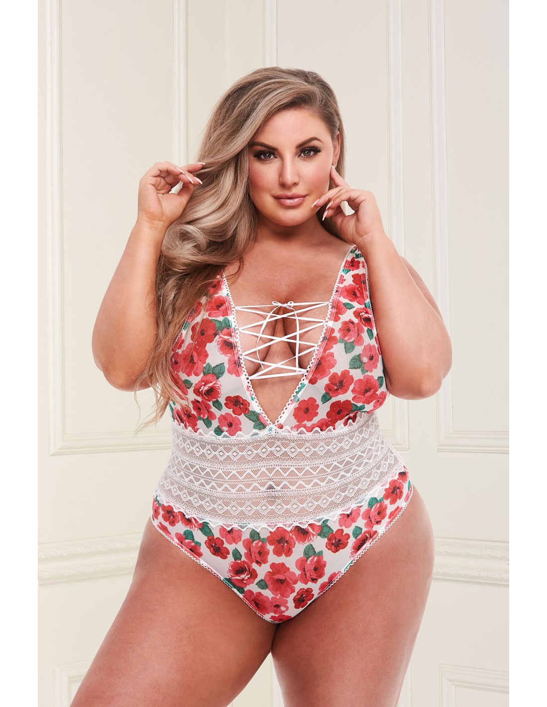 Seductor osito de peluche con flores rojas, encaje blanco y cordones en el profundo escote en forma de V. El encaje alrededor de la cintura es semitransparente.