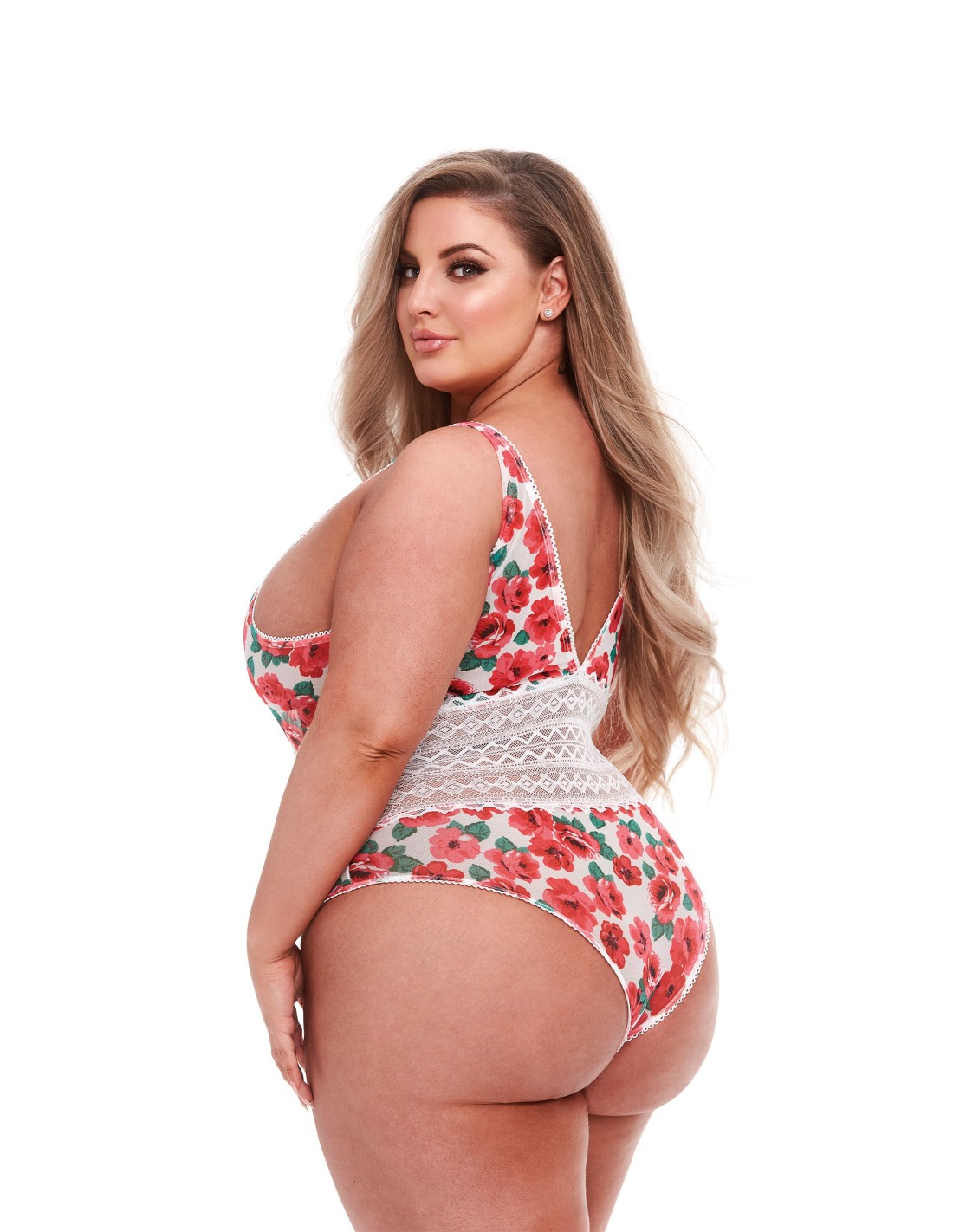 ¿Buscas el complemento perfectamente femenino, floral y coqueto para tu cajón de lencería? ¡No busques más! Este sexy y dulce osito de peluche, con un divertido estampado floral blanco, rojo y verde, está diseñado con la espalda abierta y un corte en V profundo en la parte delantera, con un divertido lazo. Un panel amplio, bordado y transparente a lo largo de la cintura rompe el look, mientras que la parte inferior presenta un corte de bikini.