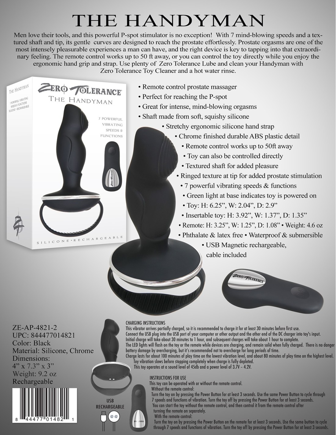 ¡Los hombres aman sus herramientas y este poderoso estimulador del punto P no es una excepción! Con 7 velocidades alucinantes y un eje y una punta texturizados, sus suaves curvas están diseñadas para llegar a la próstata sin esfuerzo. Los orgasmos prostáticos son una de las experiencias más intensamente placenteras que un hombre puede tener, y el dispositivo adecuado es clave para aprovechar ese sentimiento extraordinario. El control remoto funciona hasta a 15 metros de distancia, o puedes controlar el juguete directamente mientras disfrutas del mango y la correa ergonómicos. Usa mucho lubricante y limpia tu Handyman con un limpiador de juguetes y un enjuague con agua caliente.