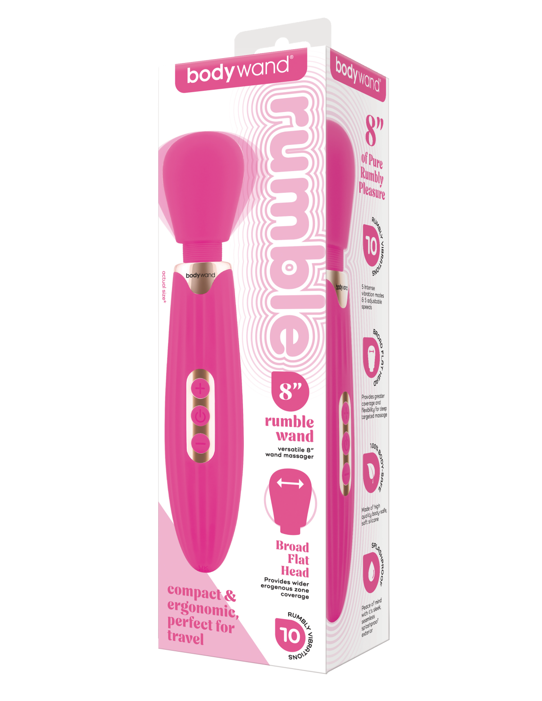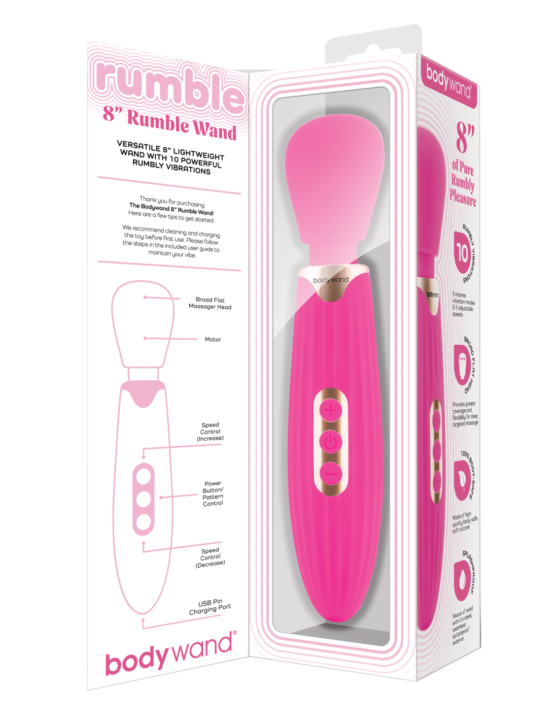 The Bodywand 8” Rumble Wand is a compact yet powerful massager designed to deliver pleasure wherever you go. The 8” Rumble Wand offers multiple functions to suit your desires with 5 vibration modes and 5 speeds to enjoy. Designed for wider erogenous zone coverage and deep targeted massage due to the broad flat head and flexible neck. Equipped with easy to use one-touch controls for effortless switching between your favorite rumbly settings, and rechargeable.
