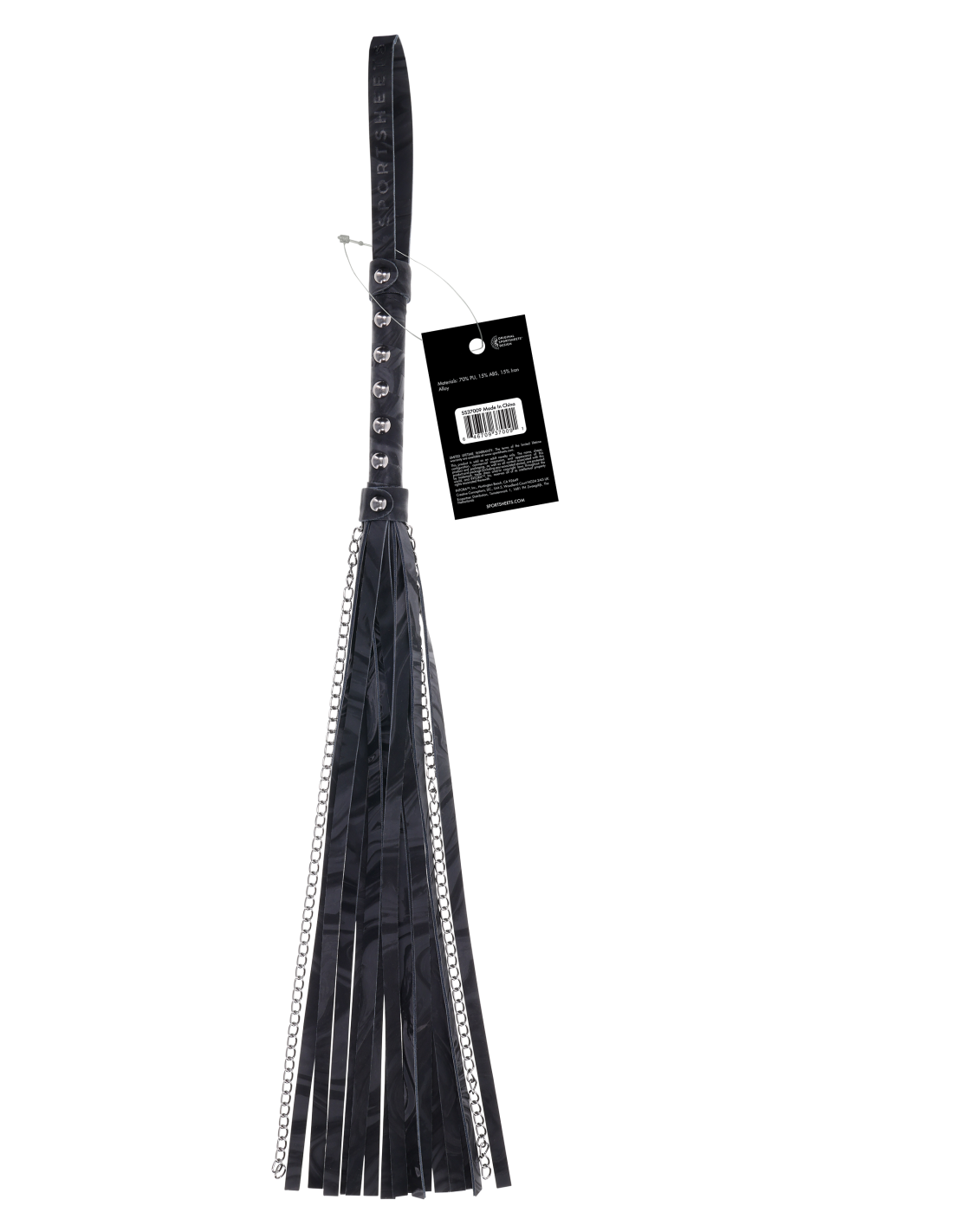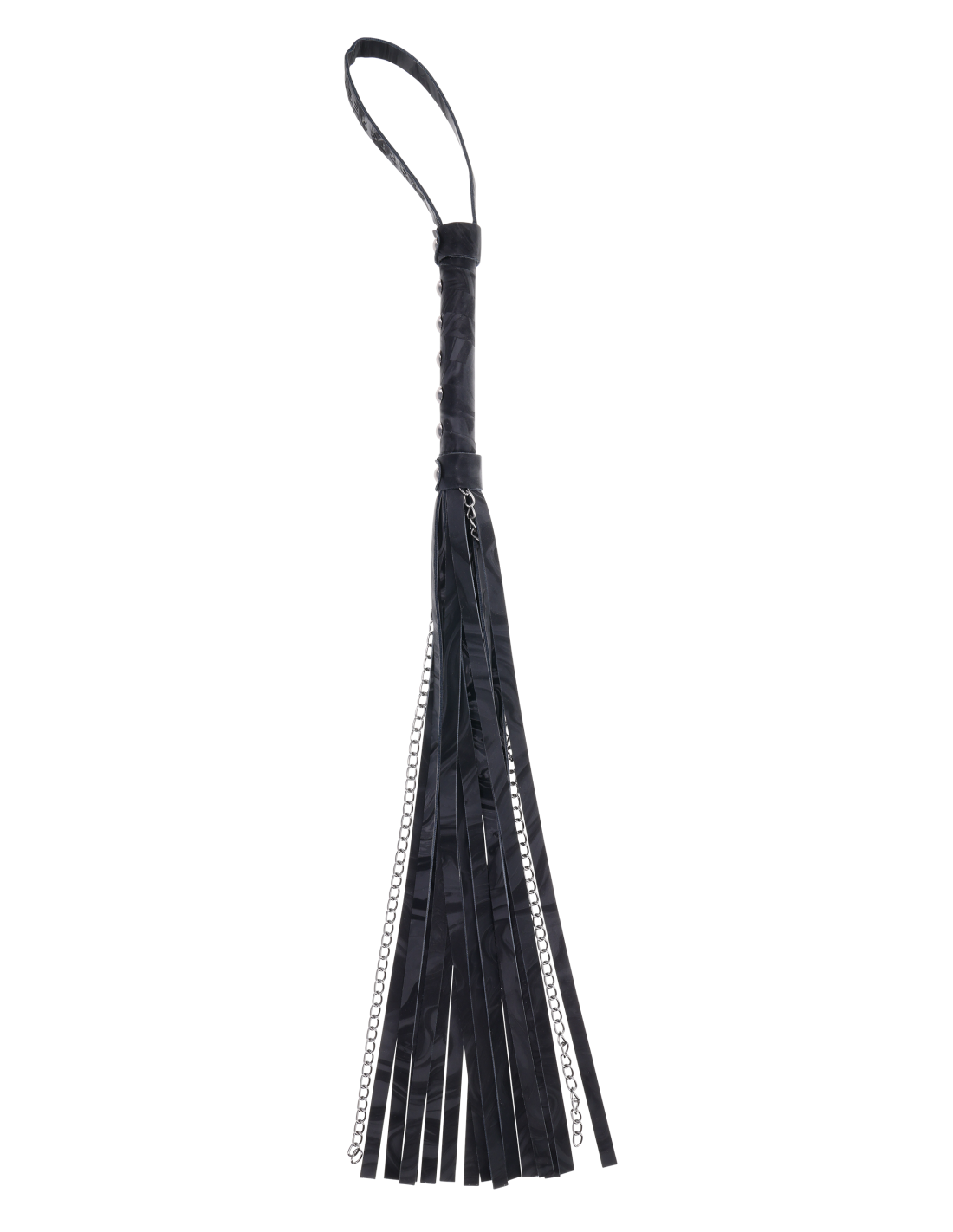 Entice the senses with every lash of the Velvet Noir Chain Flogger. This masterful blend of silky faux leather and cool hematite chains teases skin with delicate tickles or lands with a bite that lingers. Whether draping lightly across the body or delivering sharp, precise strikes, every flick creates an unforgettable sensation. The wrapped handle offers a firm grip, and the wrist loop ensures the flogger stays close at hand for whatever twists the scene demands. Refined, versatile, and just as playful as it is punishing, the Velvet Noir Chain Flogger proves that pleasure and pain have never been so elegantly intertwined.